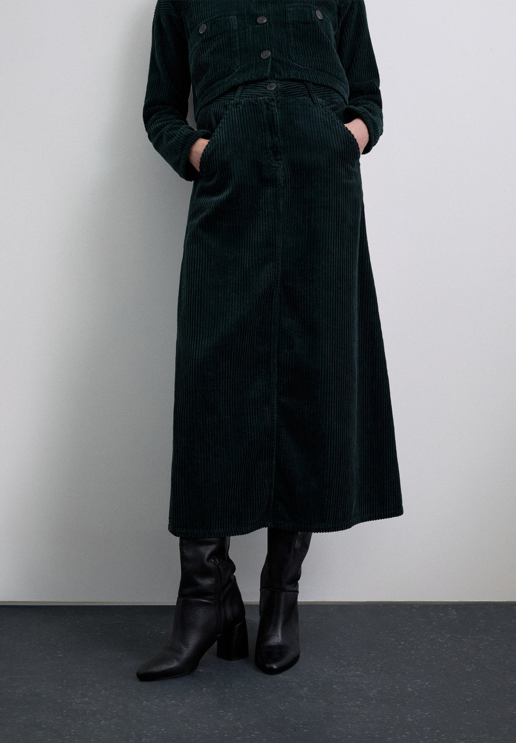 Corduroy skirt made of cotton. Pockets on the front. Zip and button fastening. Midi length. Belt loops.