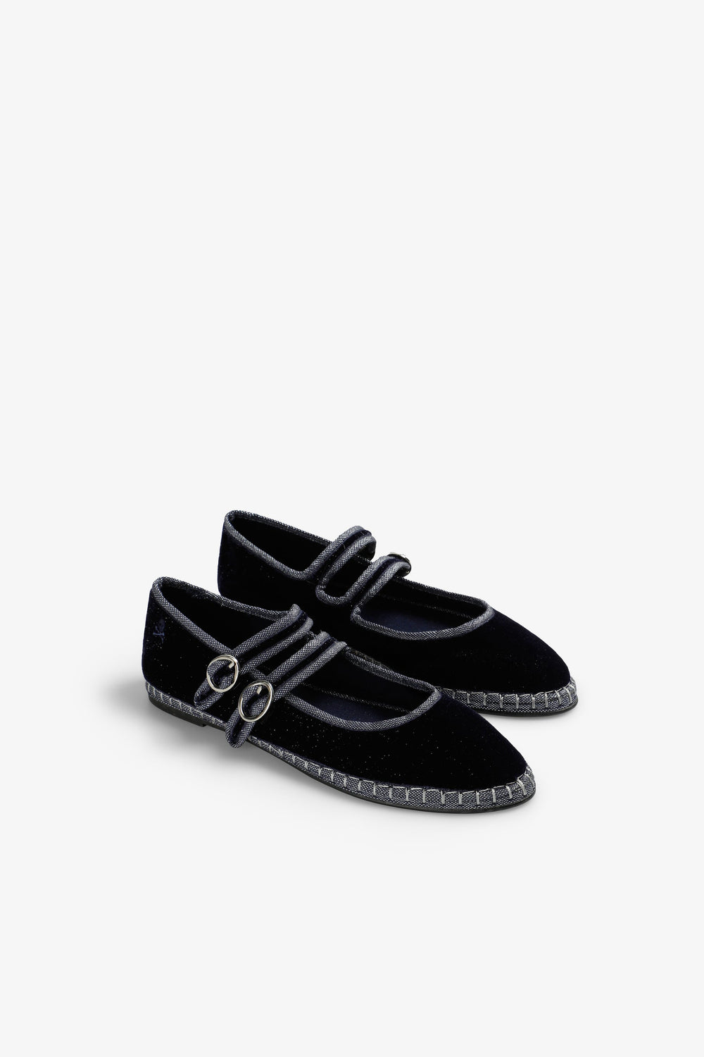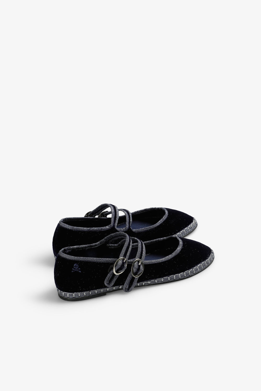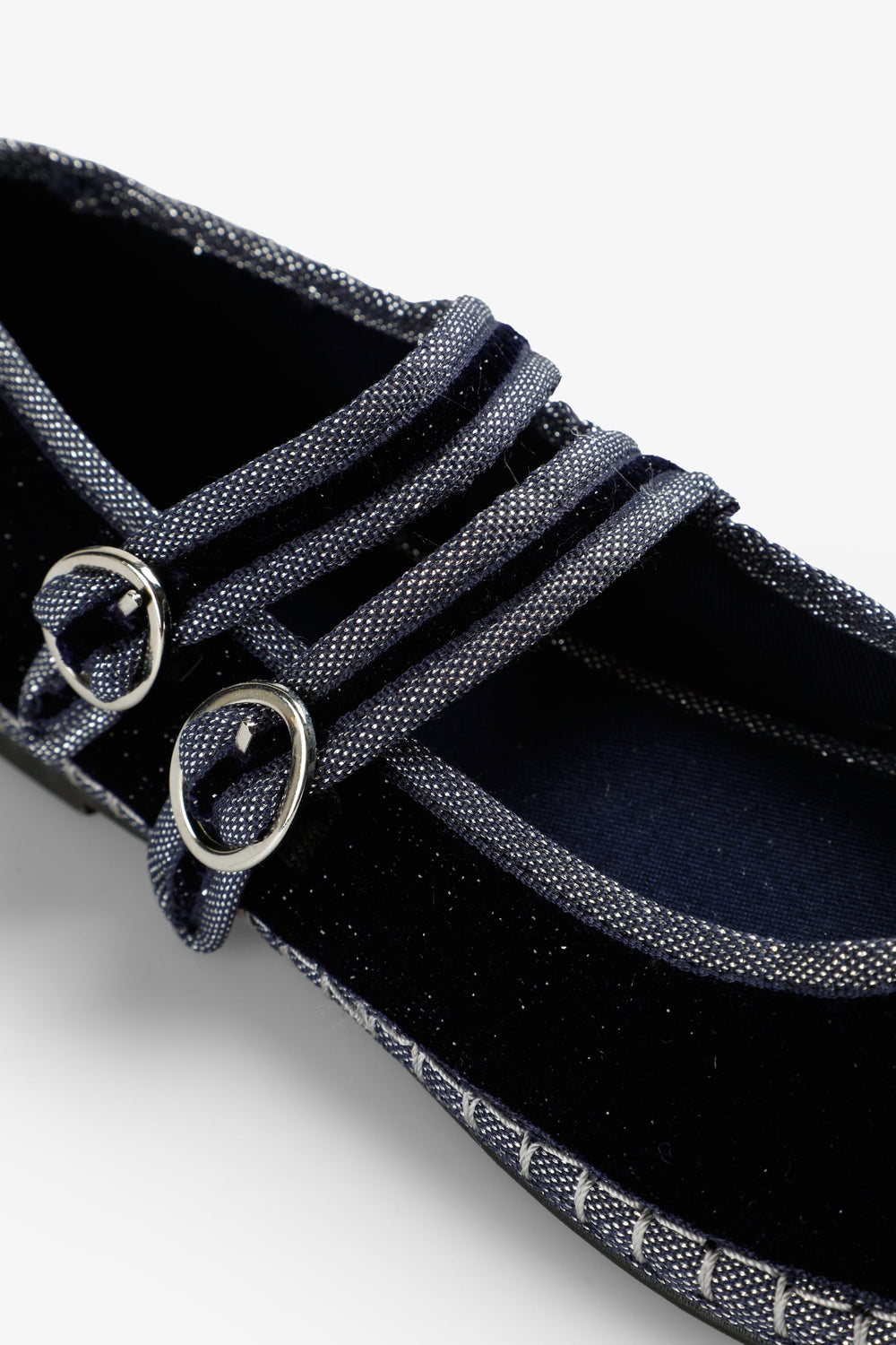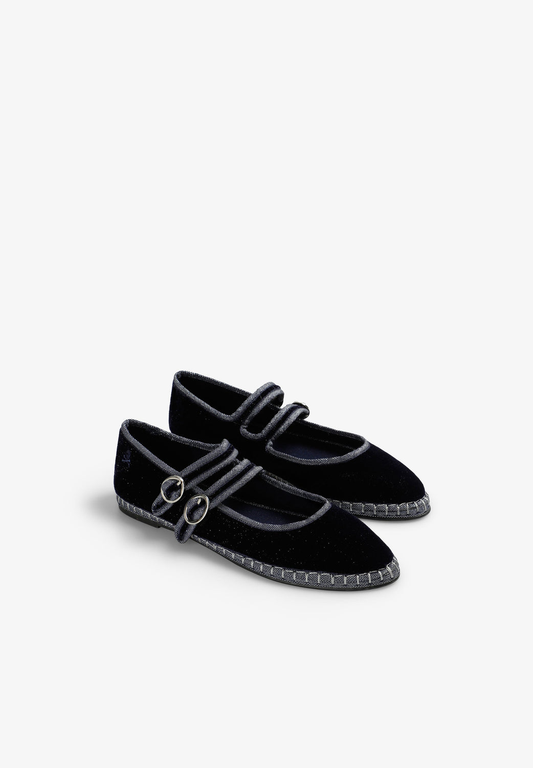 Velvet ballet flats. Adjustable double strap. Tonal stitching and logo detail. Cotton lining.