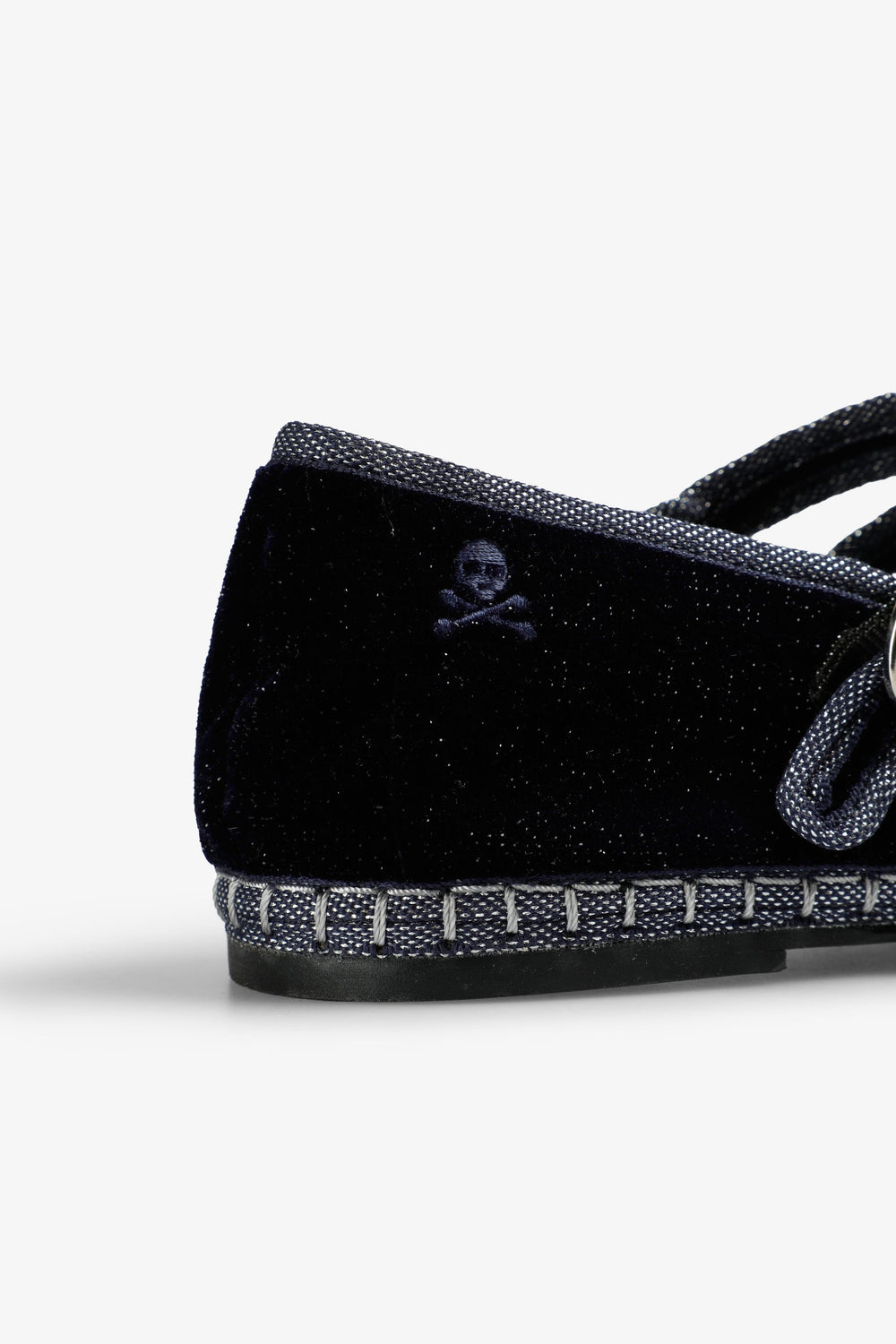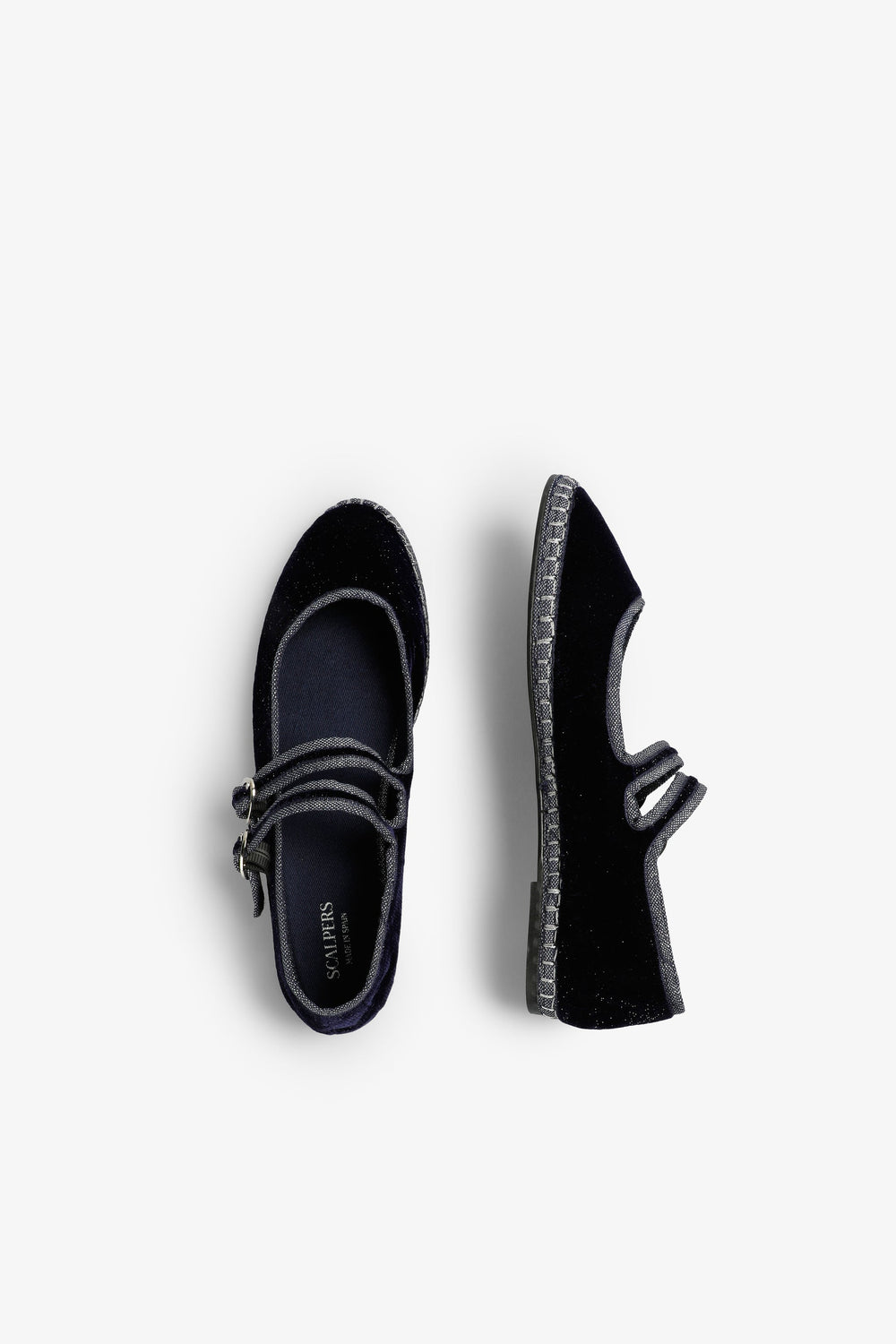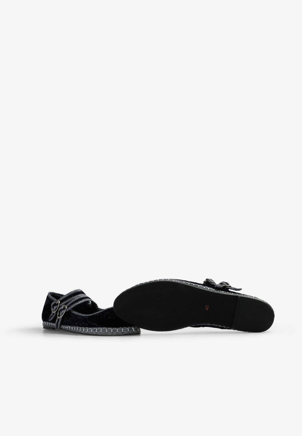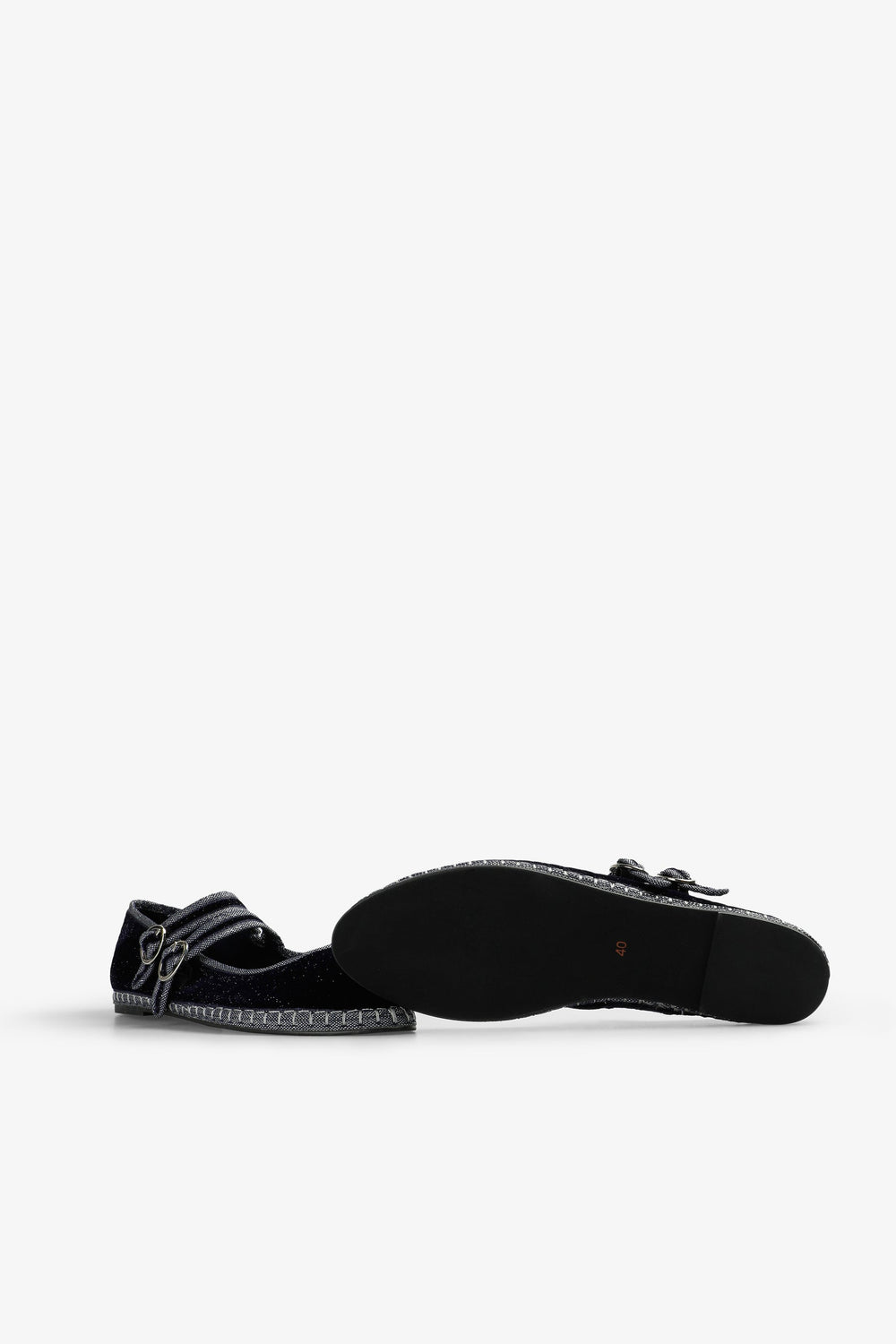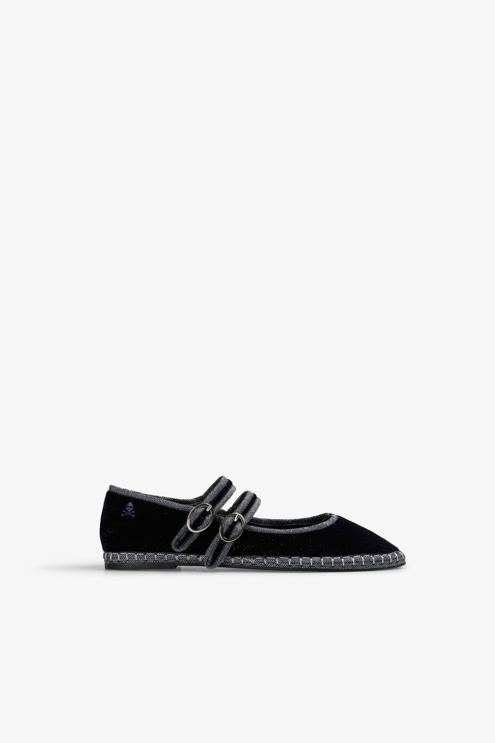 Velvet ballet flats. Adjustable double strap. Tonal stitching and logo detail. Cotton lining.