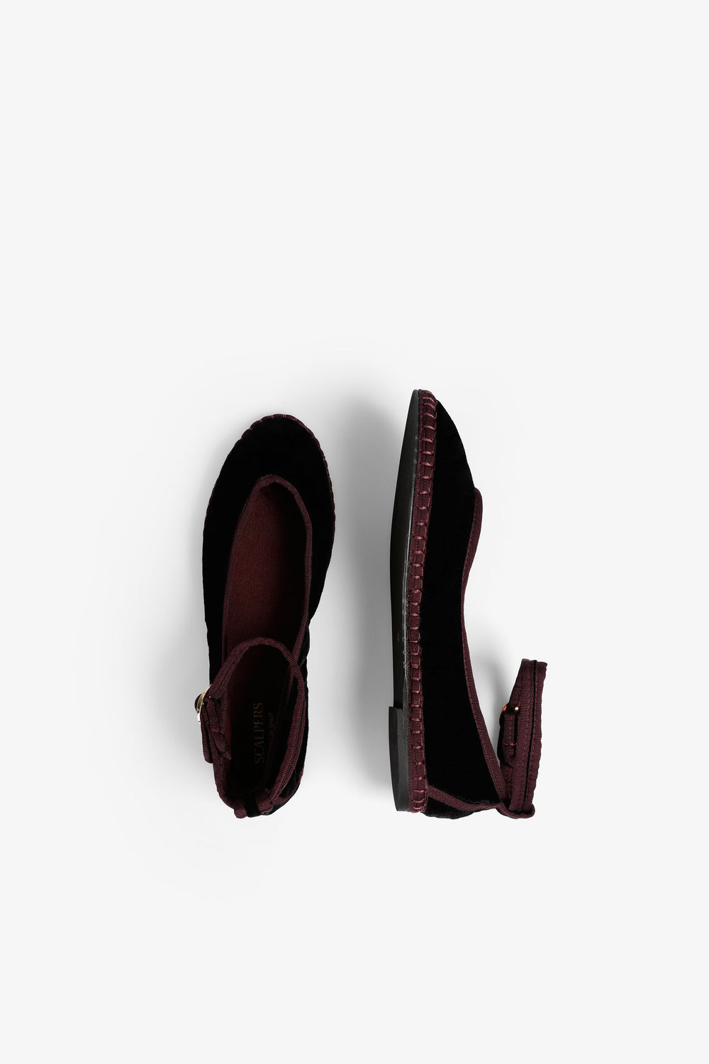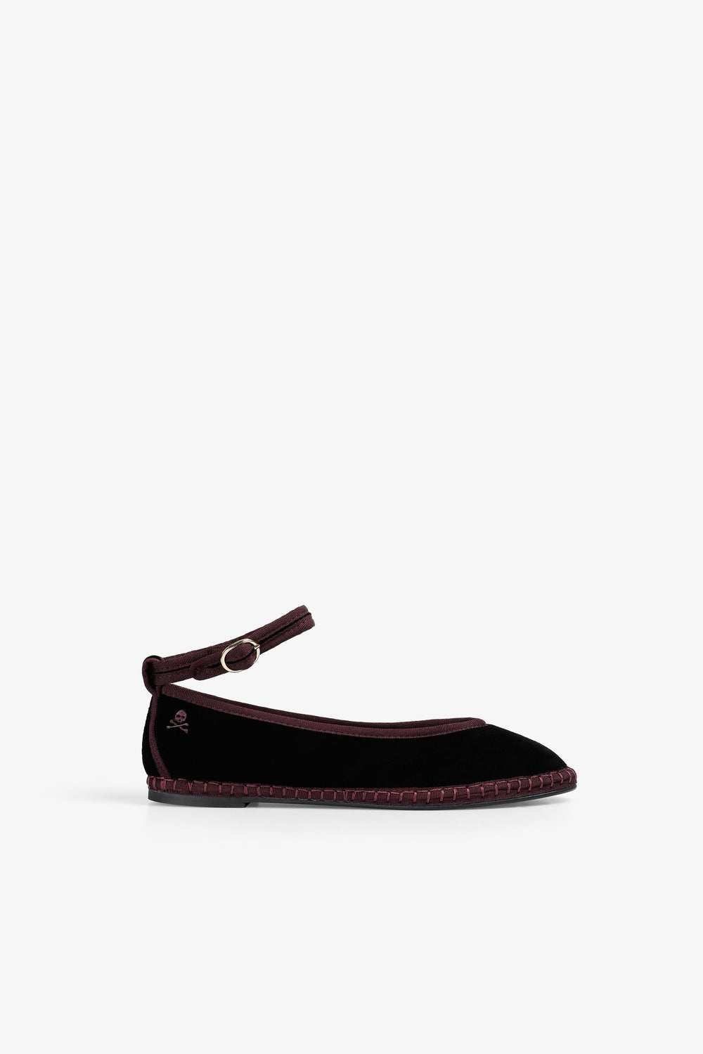 Velvet ballet flats with adjustable ankle strap. Contrast stitching and logo. Cotton lining.