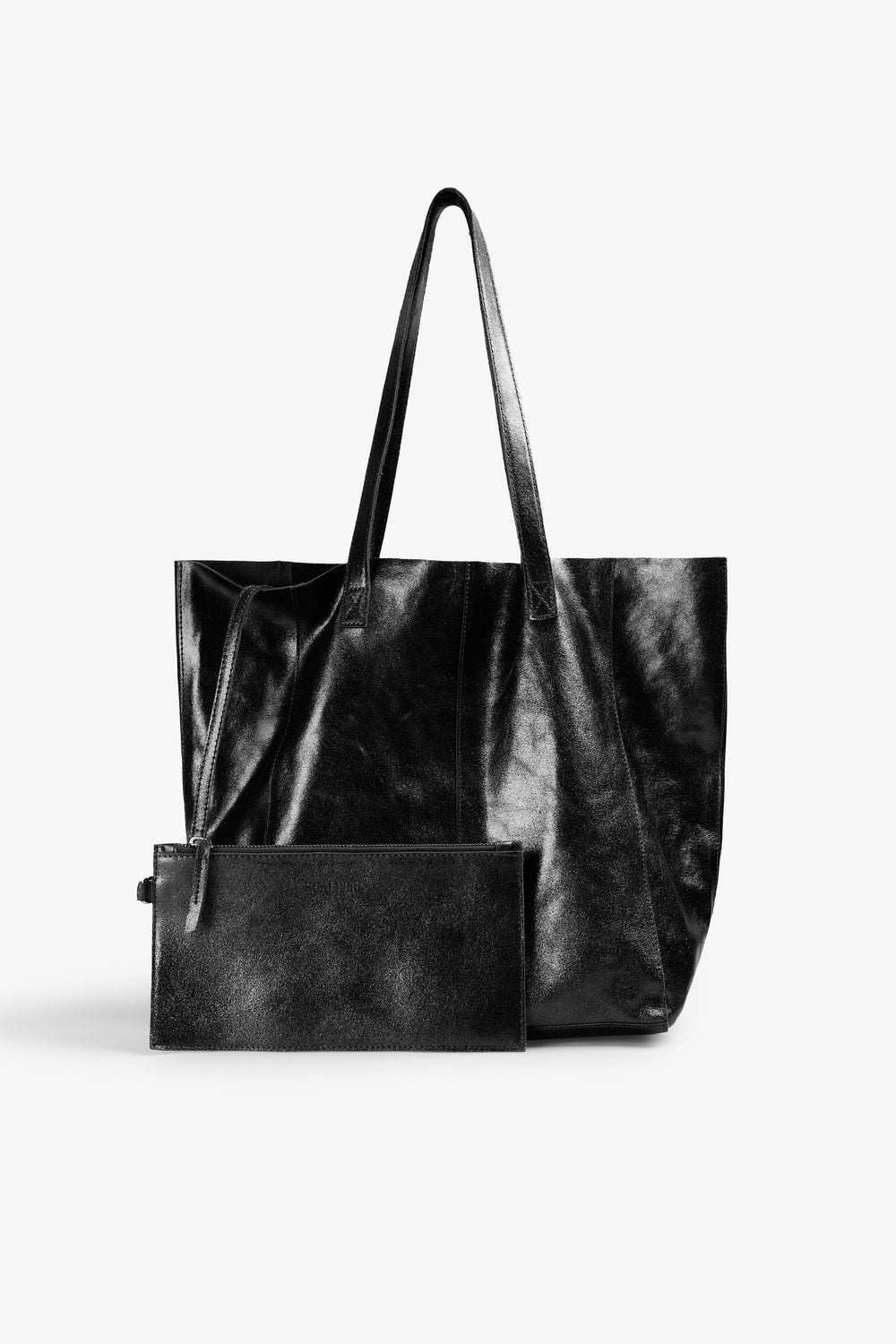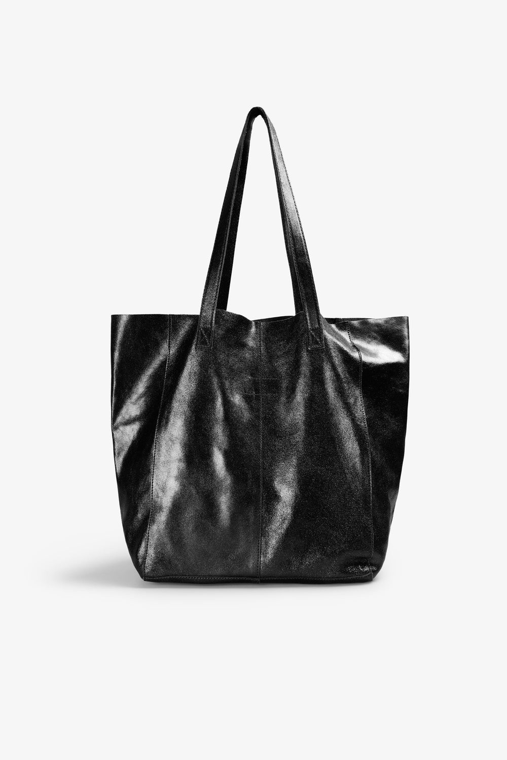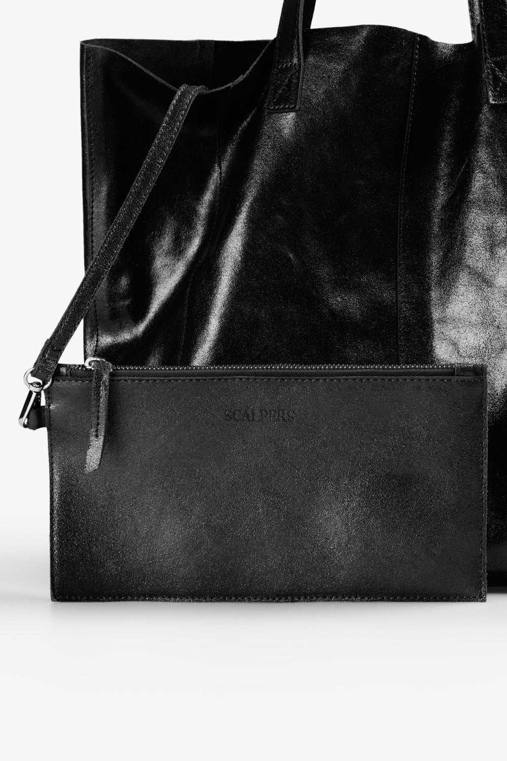 Tote bag made of 100% suede with metallic finish. Reverse side leather inside with matching zip-up wallet.