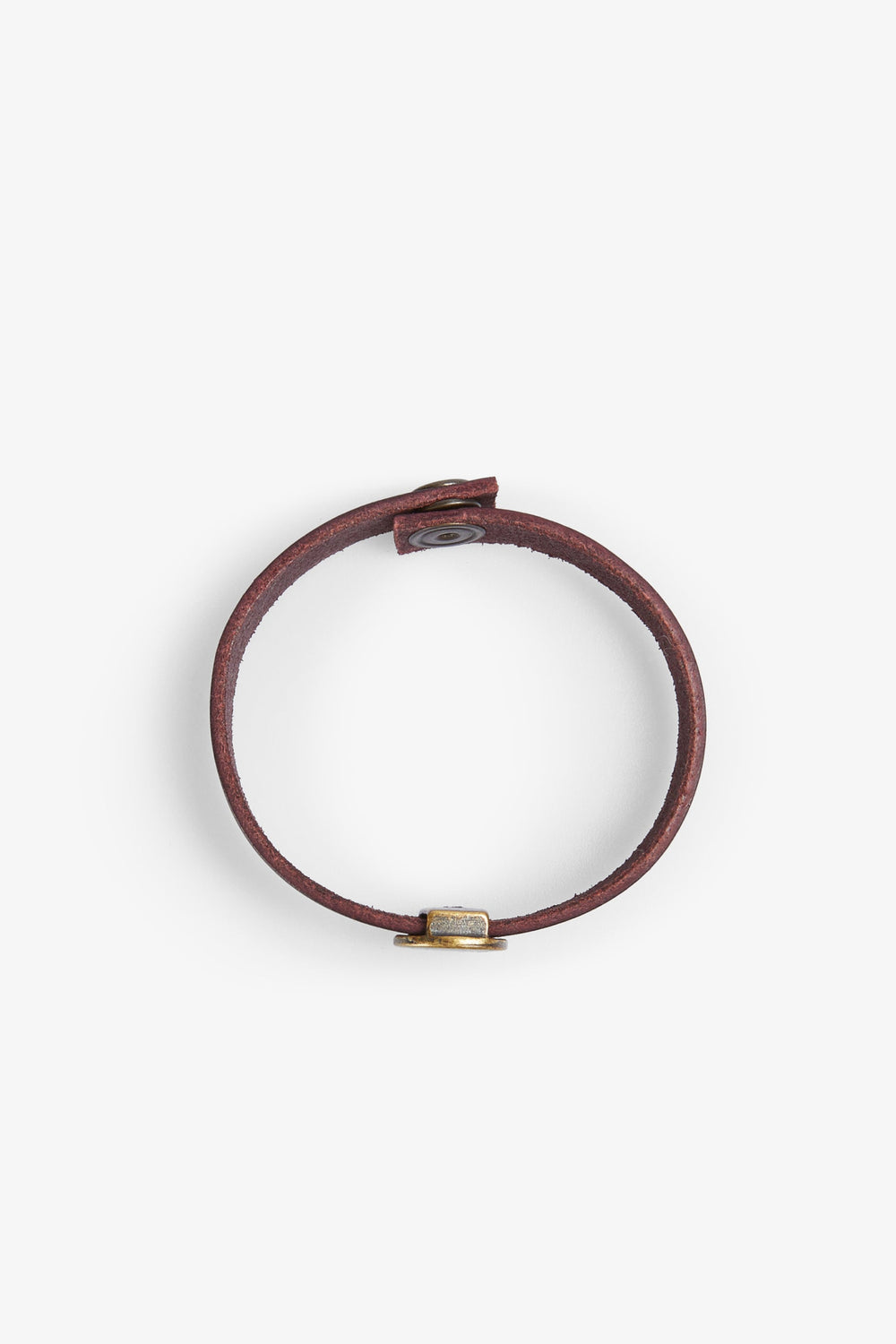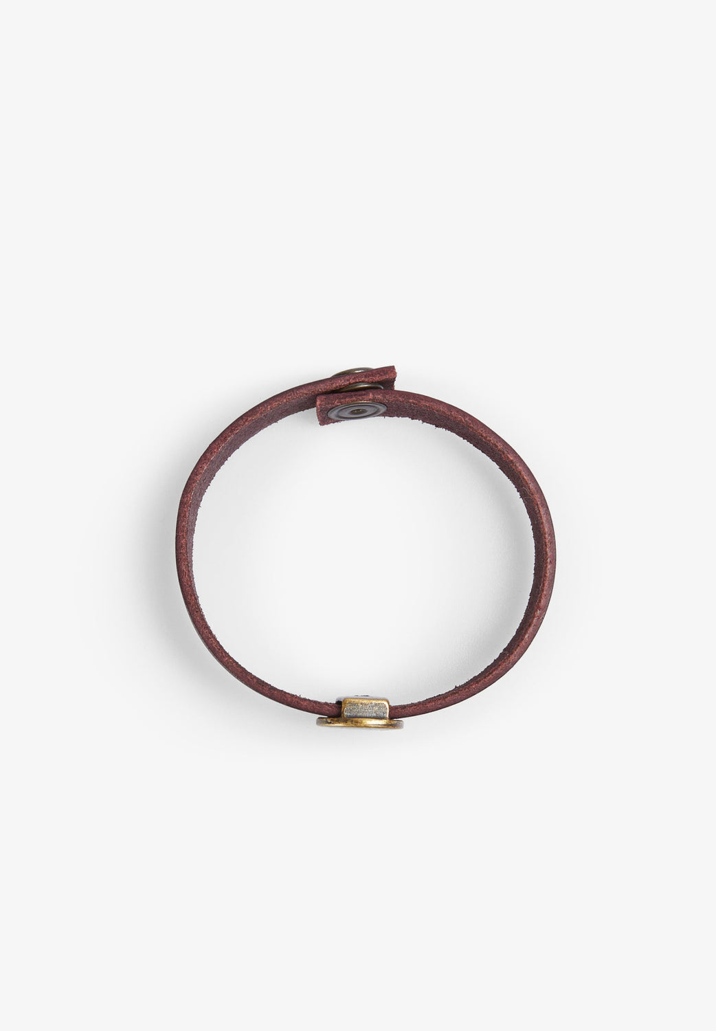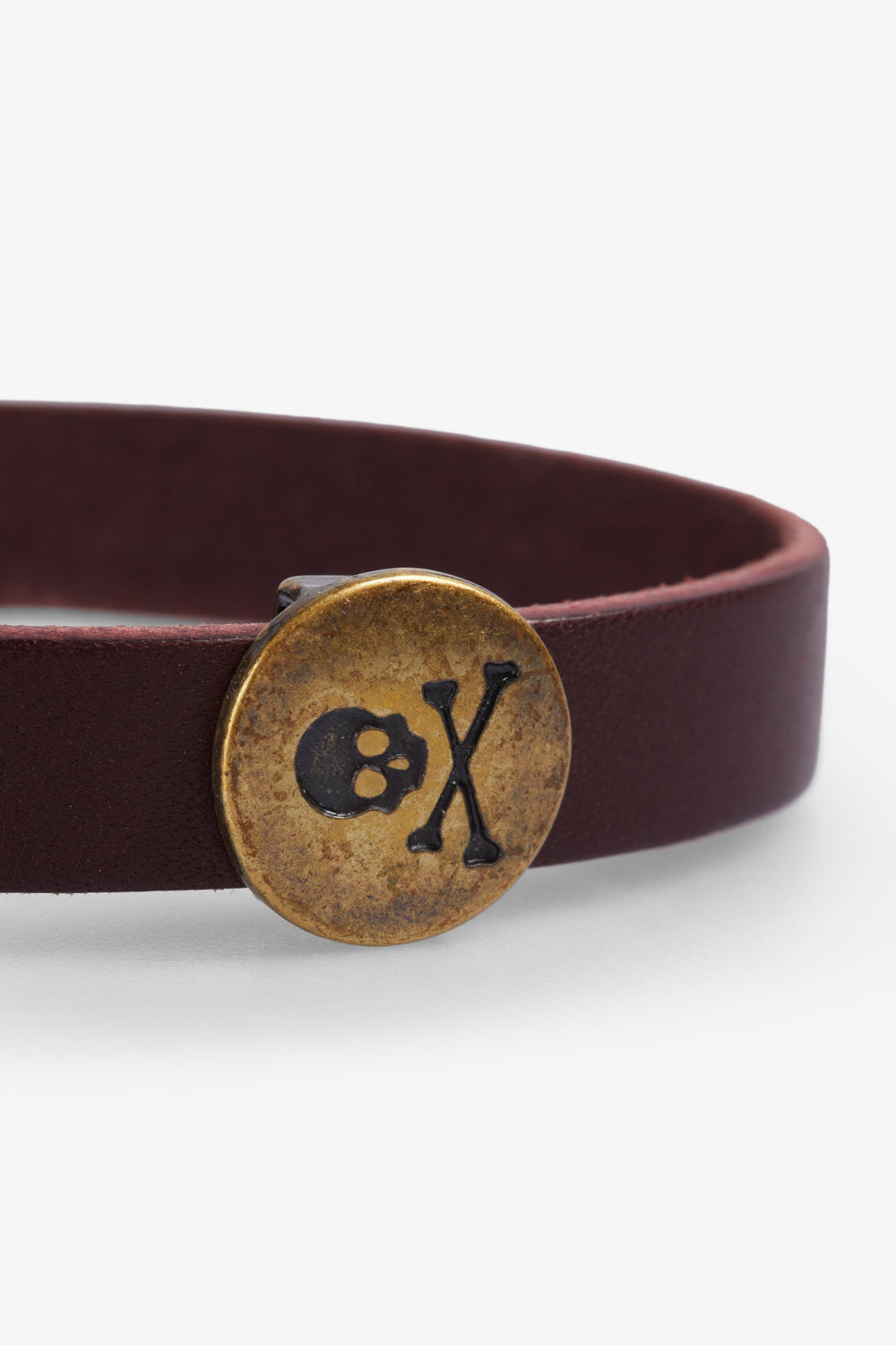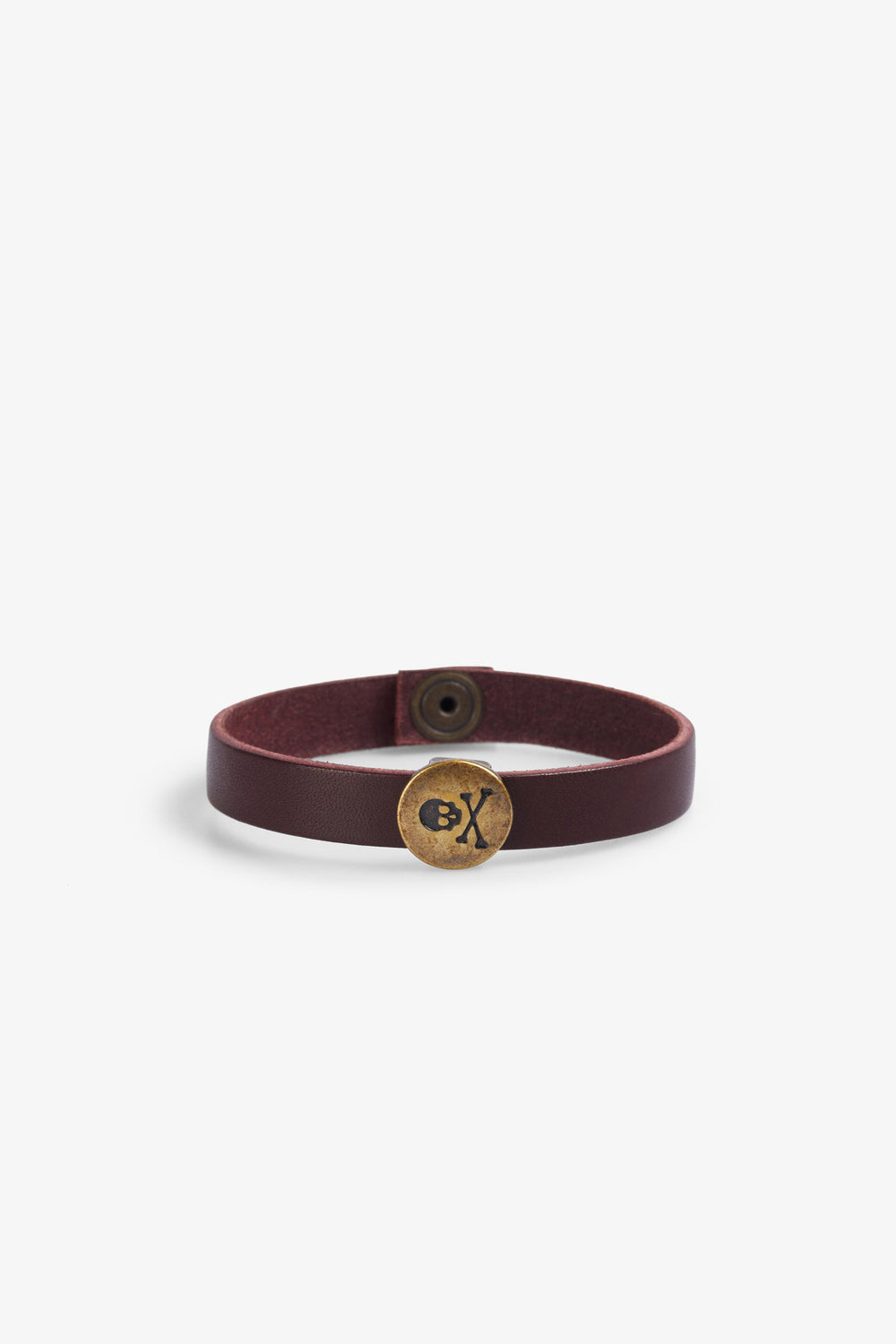 Bracelet made of 100% leather. Metal appliqué detail with skull. Snap button closure.