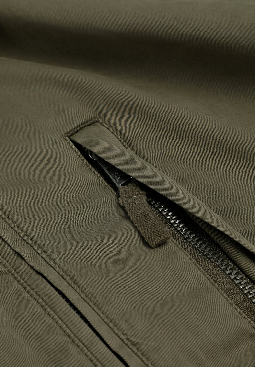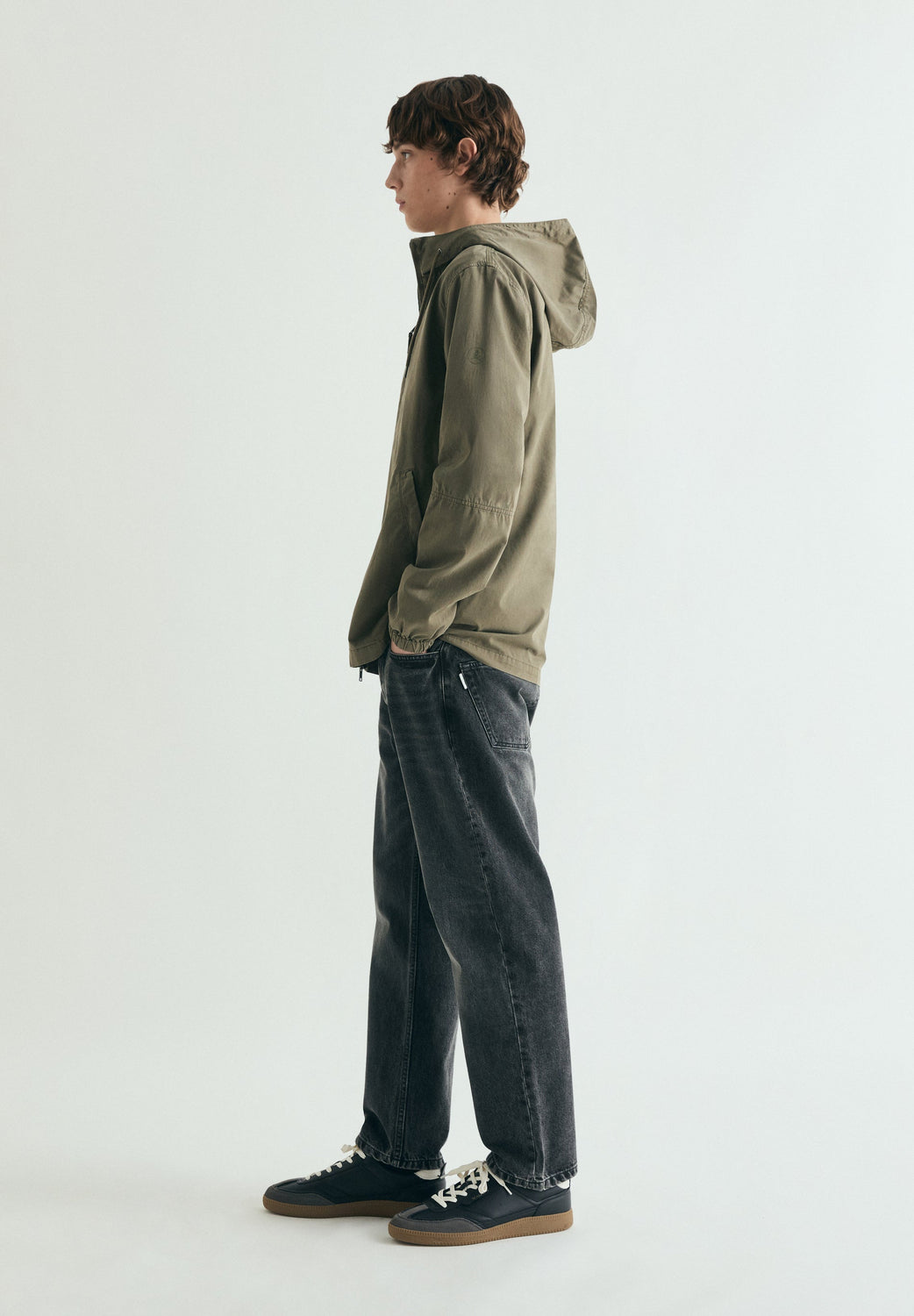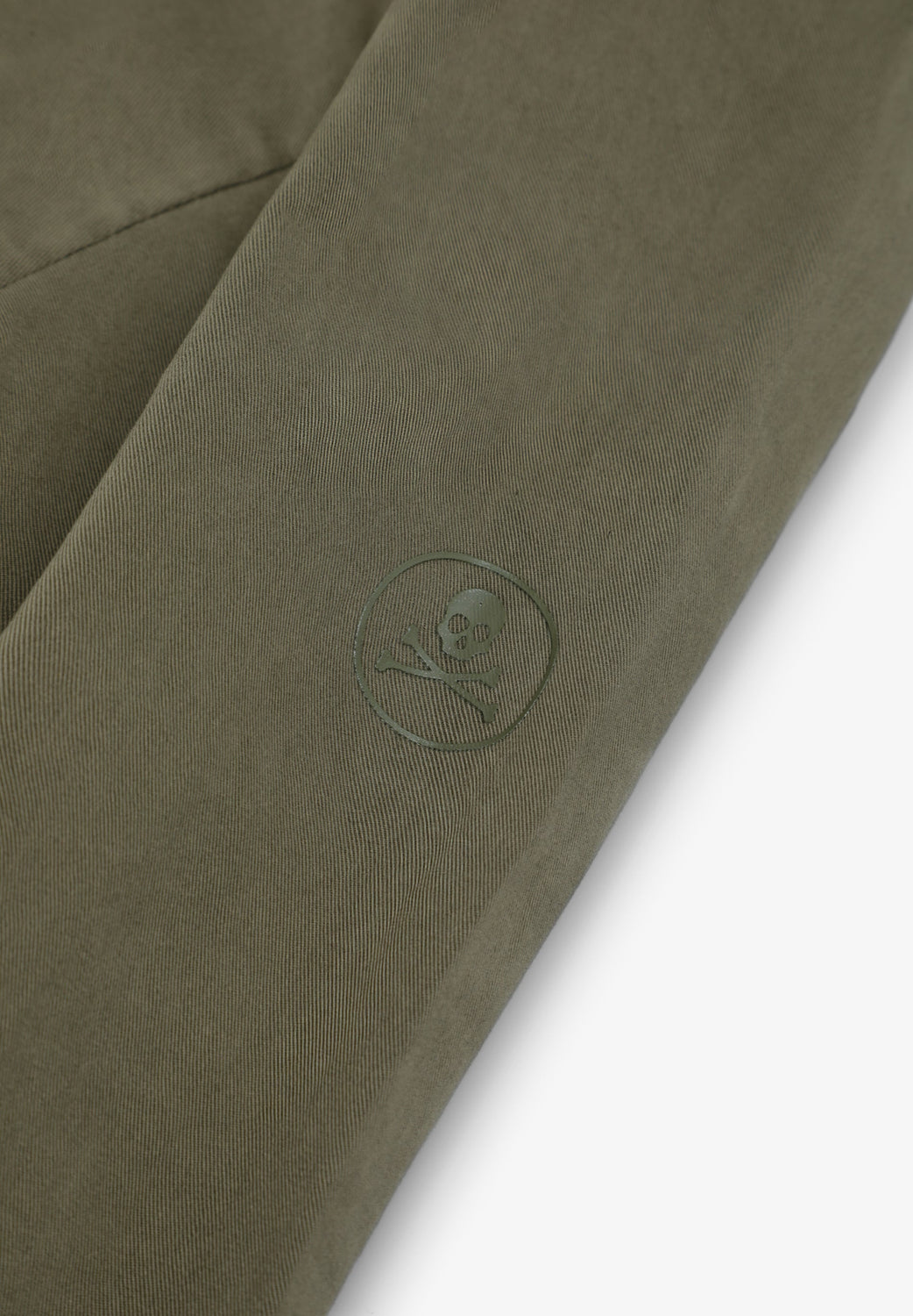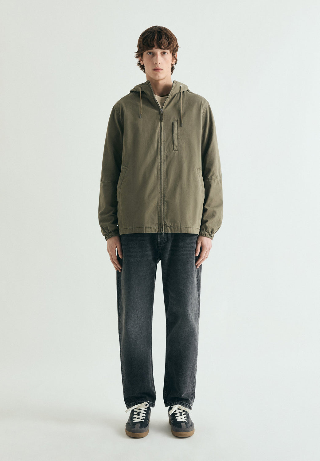 Jacket made of 100% BCI cotton. Hooded. Stand-up collar with adjustable drawstring. Three front pockets with press-stud fastening. Inner pocket. Stand-up collar Tonal skull on left sleeve.
