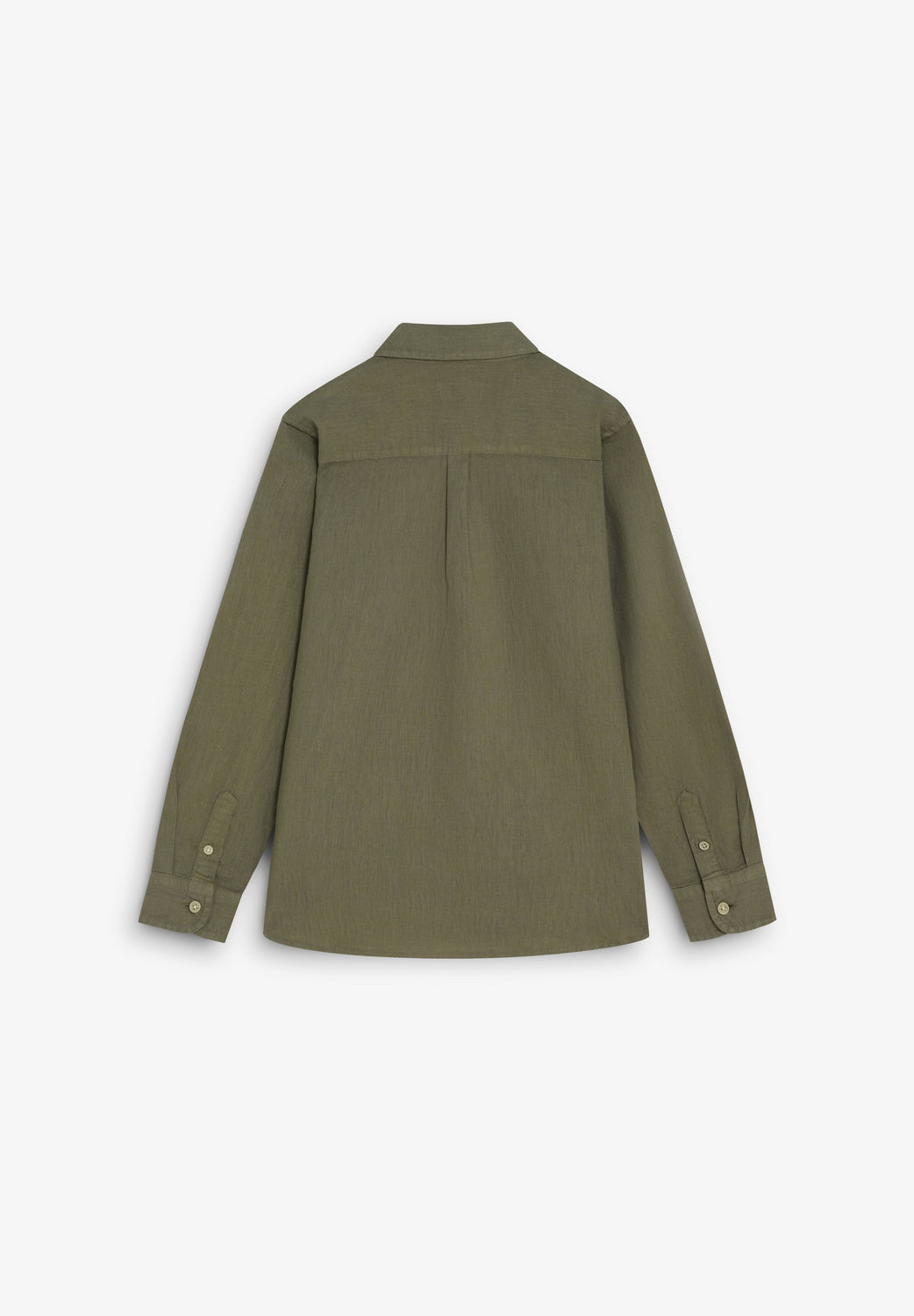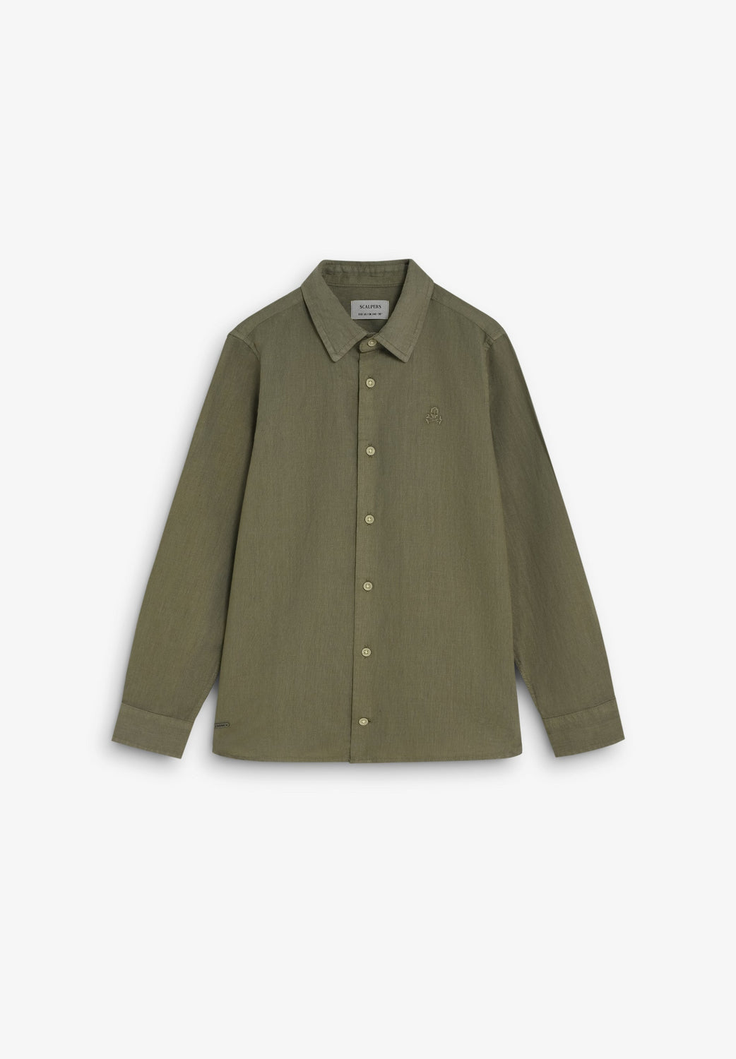Made of a BCI cotton and linen blend. Classic collar and front button fastening. Matching embroidered skull on the chest. Regular fit with buttoned cuffs. Metal tag detail with logo at the bottom.