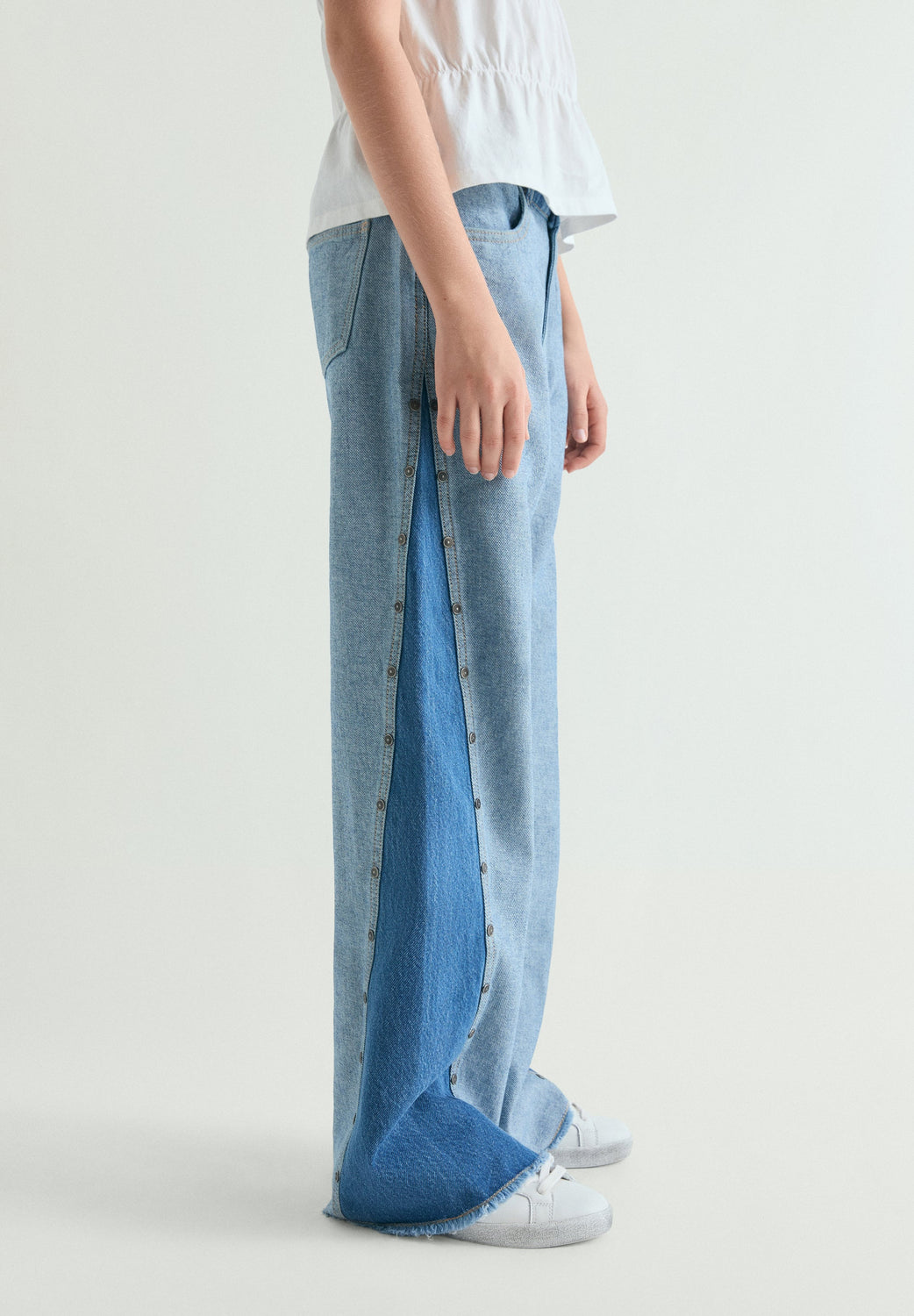 Mid-rise wide leg jeans made of 100% cotton. Contrast two-tone design. Front button and zip fastening. Front and back pockets. Frayed hems. Side slit detail with studs.