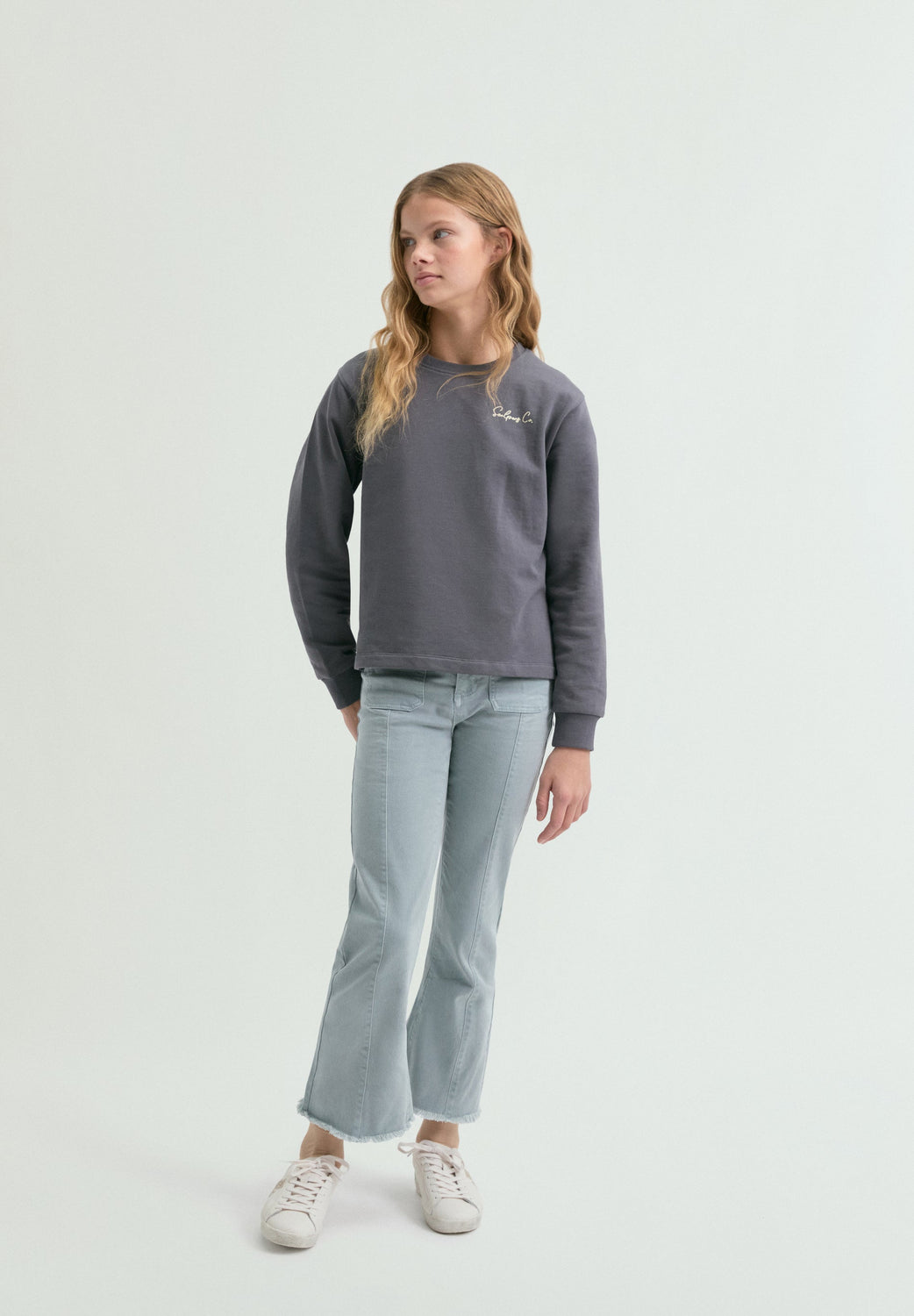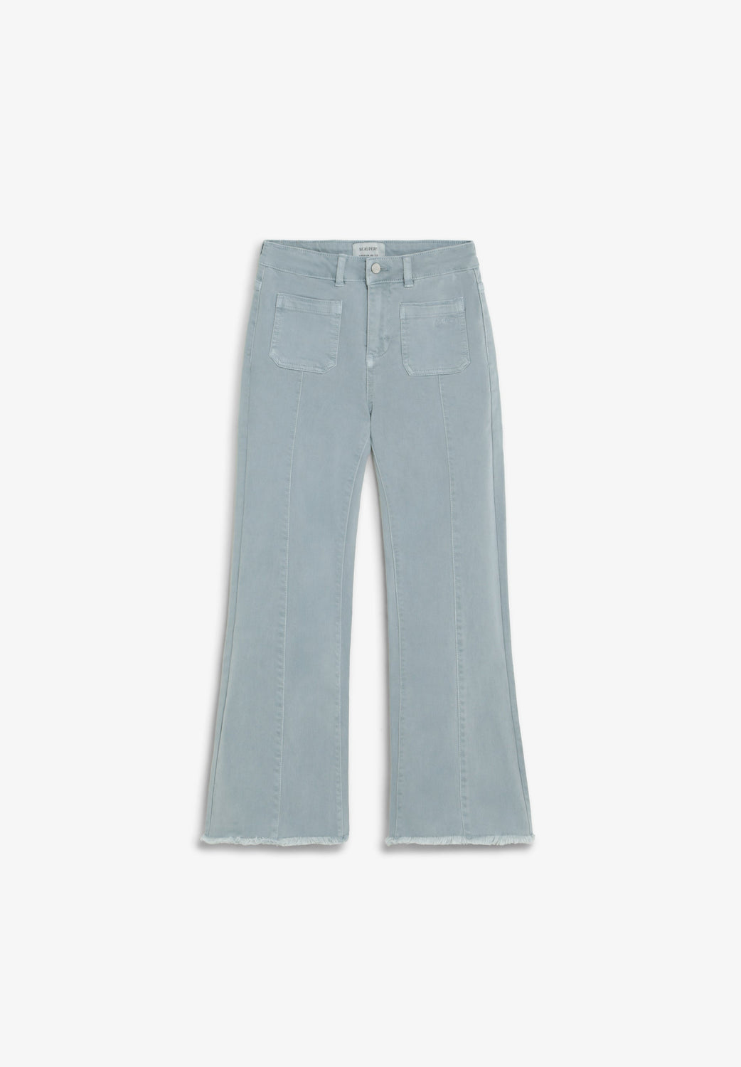 Flared trousers made of cotton. Front button and zip fastening. Belt loops at the waist. Patch pockets on front and back. Slightly flared leg from the knee. Frayed finish on the hems. Front seams. Tonal embroidered detail on left front pocket.