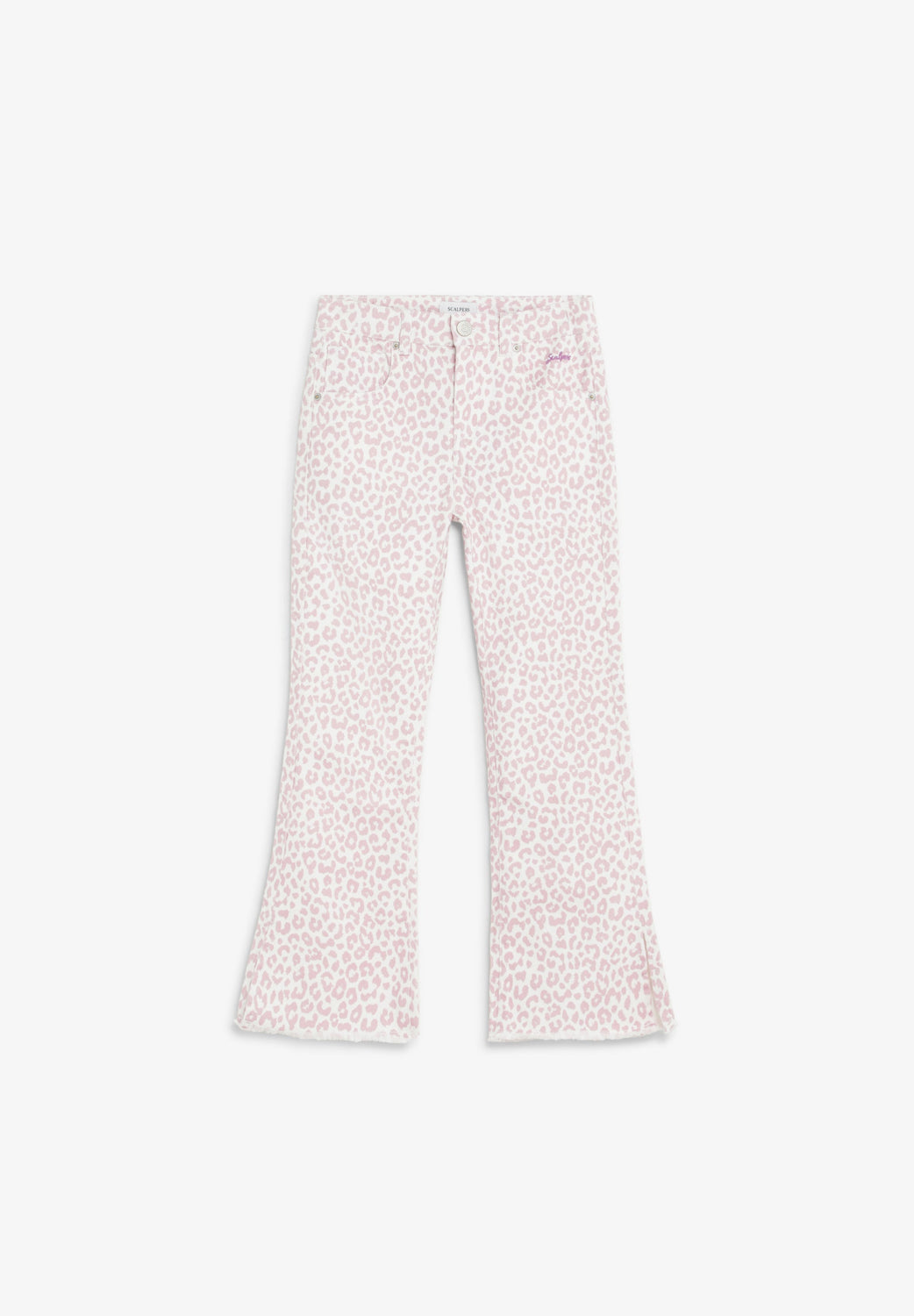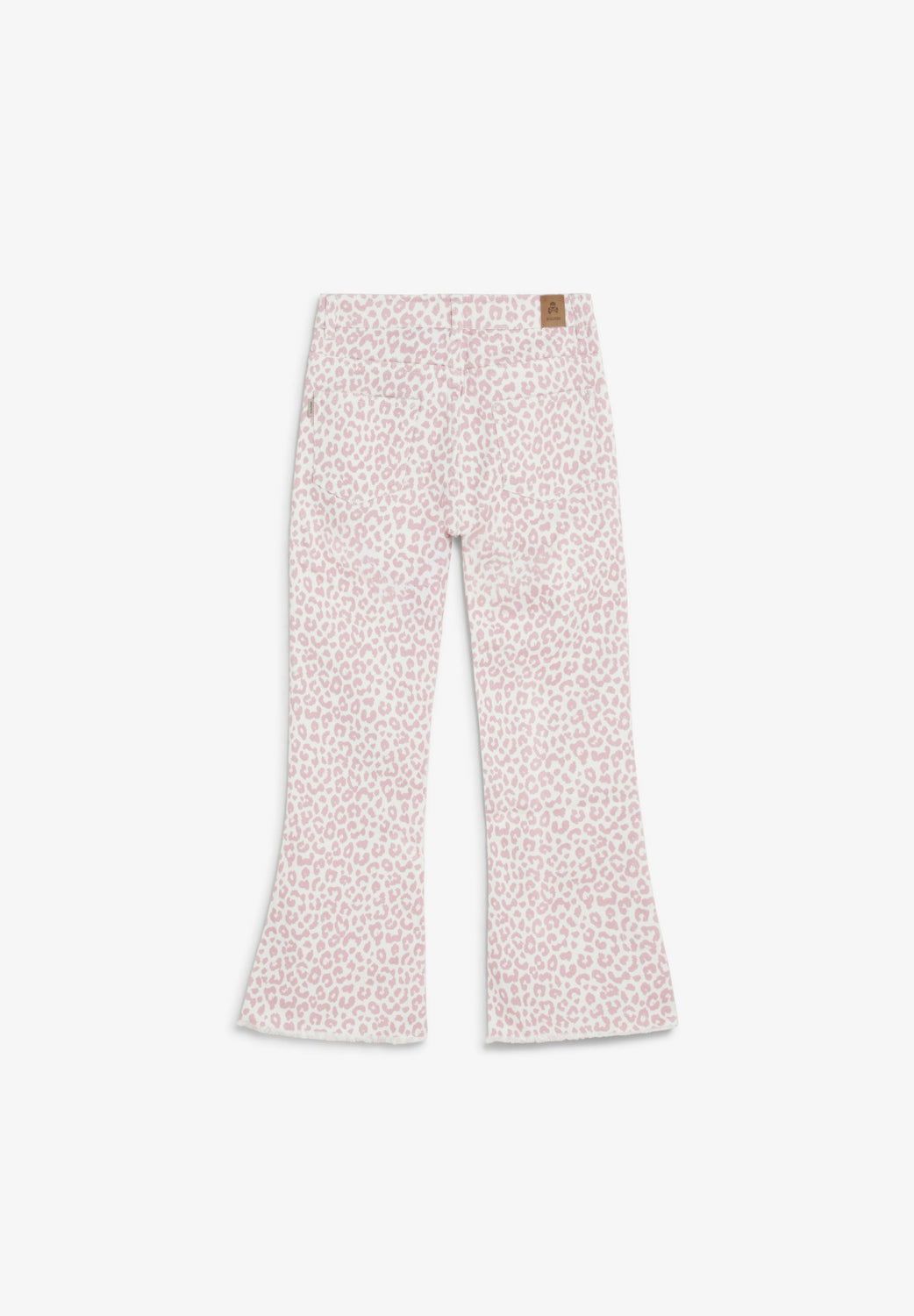 Denim trousers made of slightly stretch cotton fabric. Flared. Animal print. Front button and zip fastening. Belt loops at the waist. Front and back pockets. Frayed finish on the hems. Embroidered logo detail on the front left.