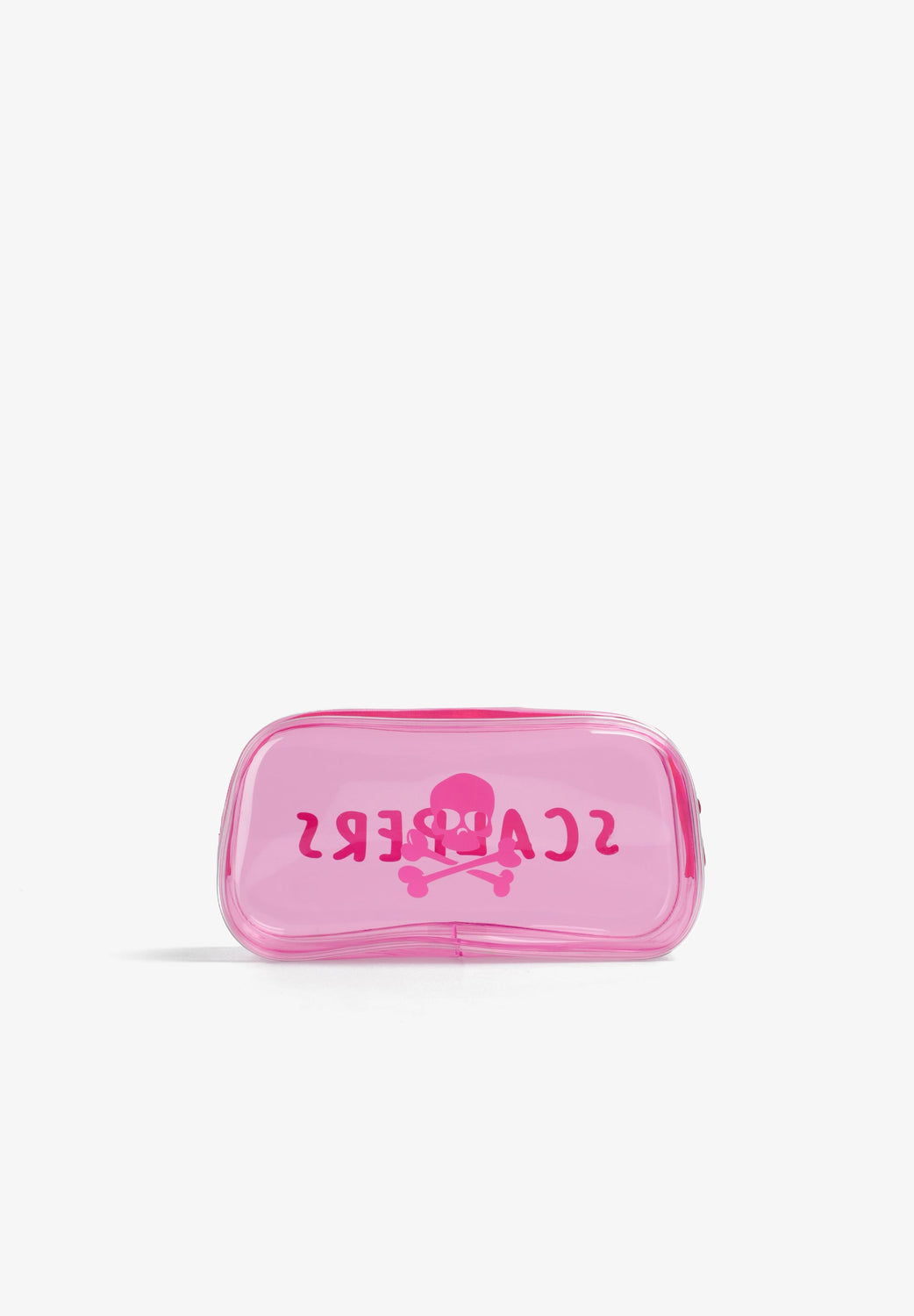 Transparent toiletry bag with zip fastening. Side print with skull and logo. Includes transparent bottles for liquids.