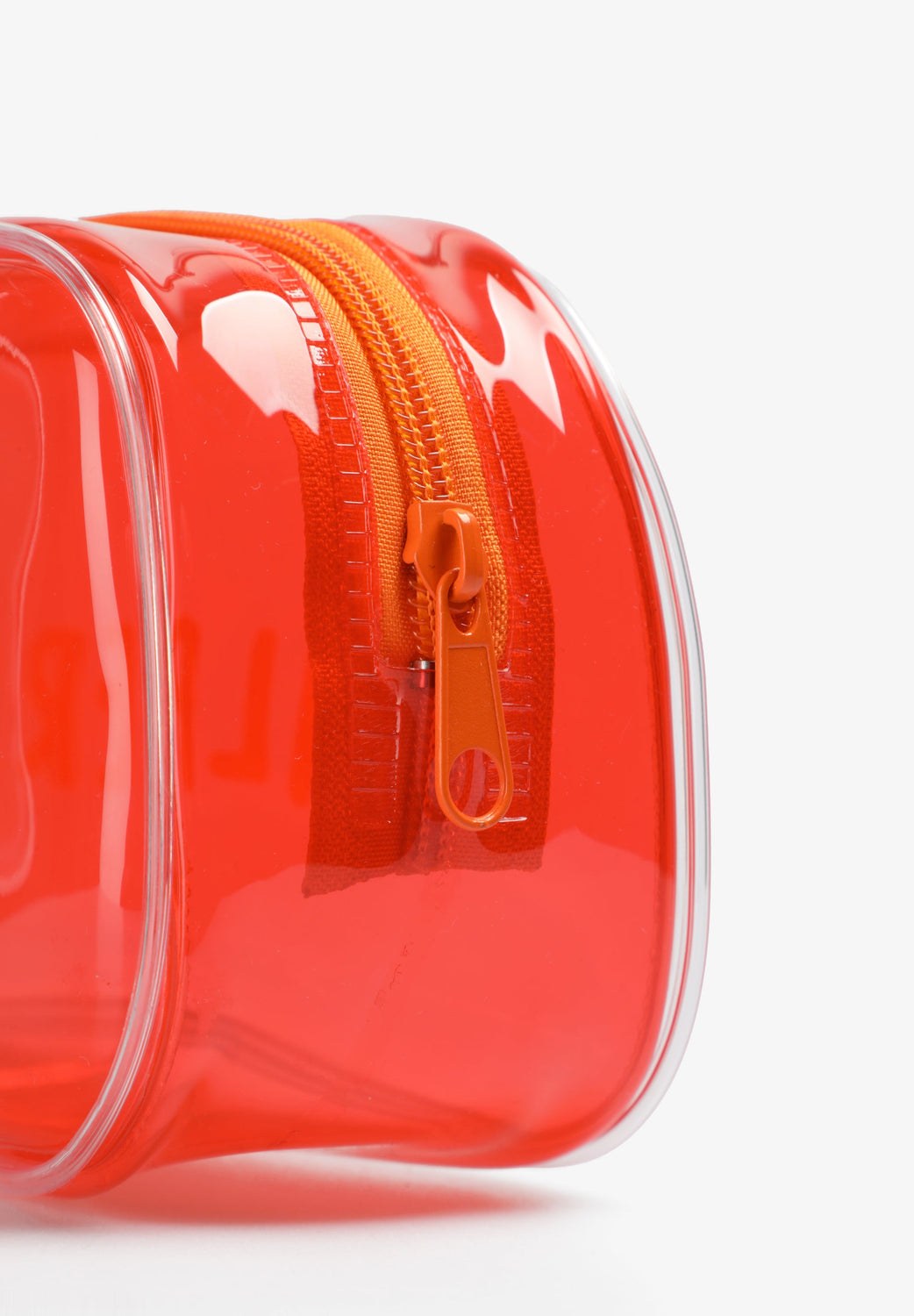 Transparent toiletry bag with zip fastening. Side print with skull and logo. Includes transparent bottles for liquids.