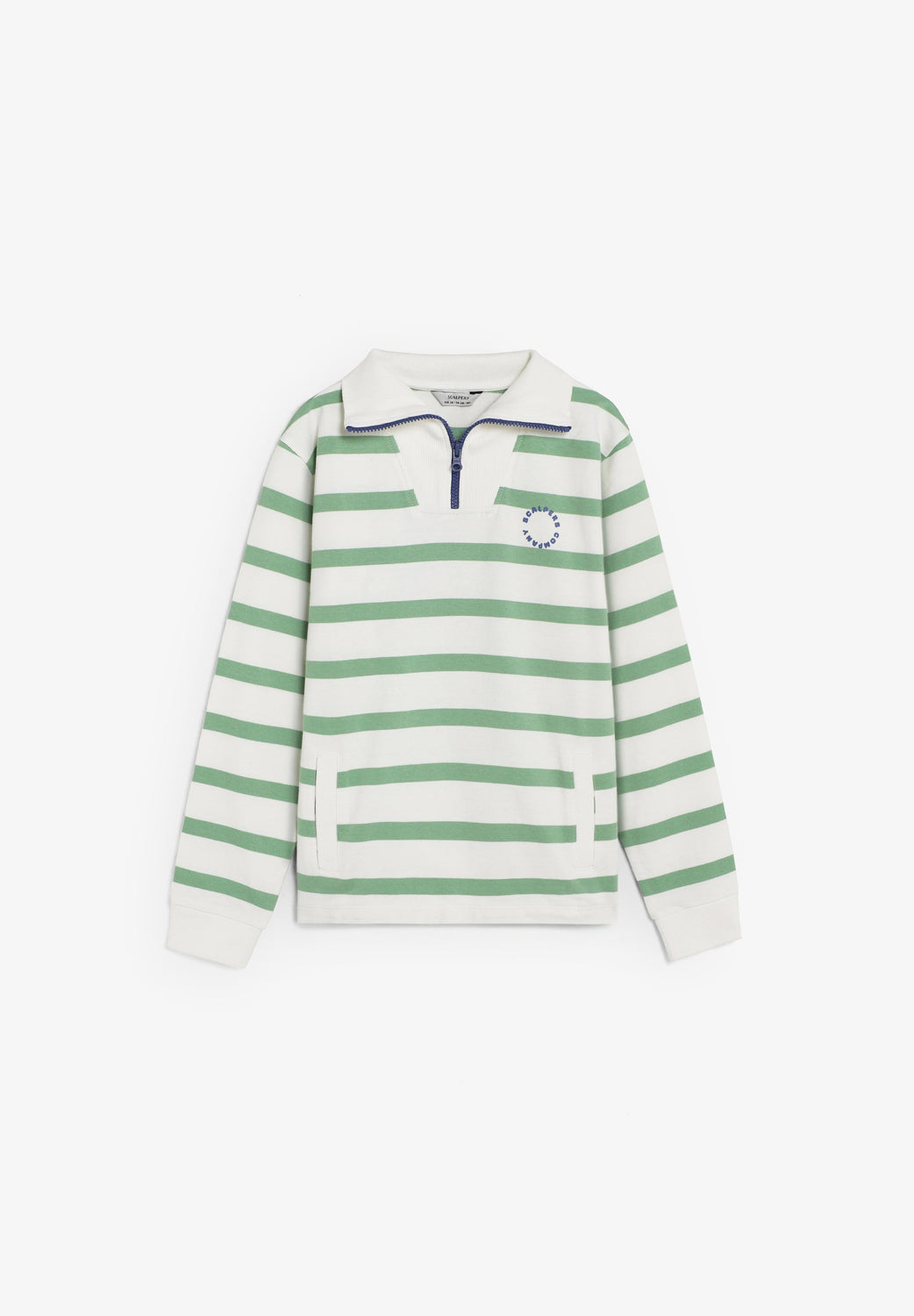 Striped sweatshirt made of 100% BCI cotton with polo shirt collar. Front zip fastening. Pouch pocket. Logo detail on chest and printed skull logo on back. Ribbed cuffs and hem.