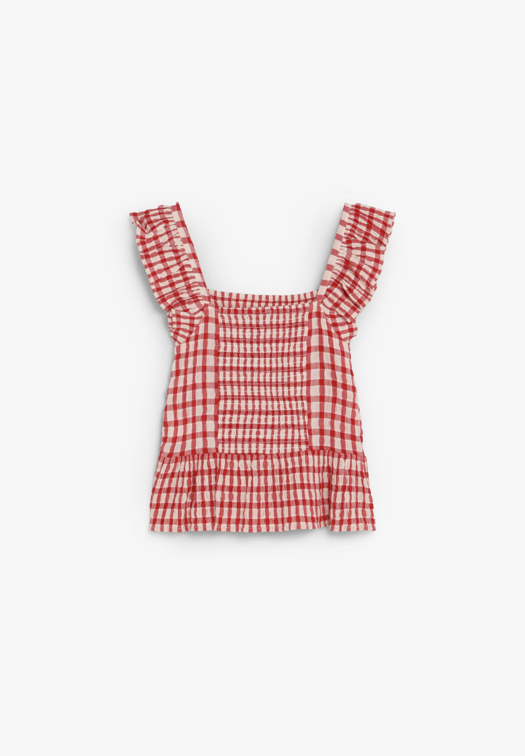 Top made of 100% BCI cotton. Regular Fit. Gingham print. Straps with ruffles. Smocked detail. Ruffle on the hem.