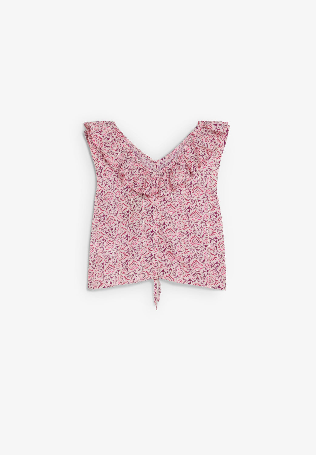 Blouse made of flowing fabric. Relaxed fit. V-neck with ruffle. Adjustable front drawstring.