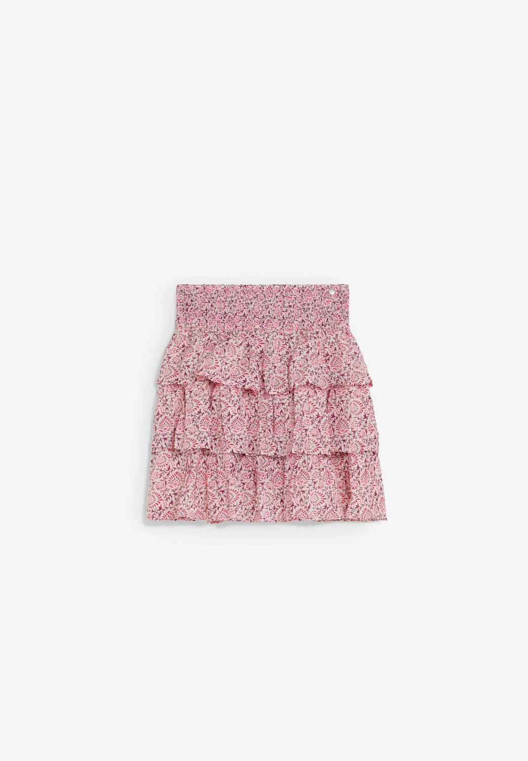 Short skirt made of a lightweight fabric. Smocked detail at the top with ruffled hem. Multicoloured print.