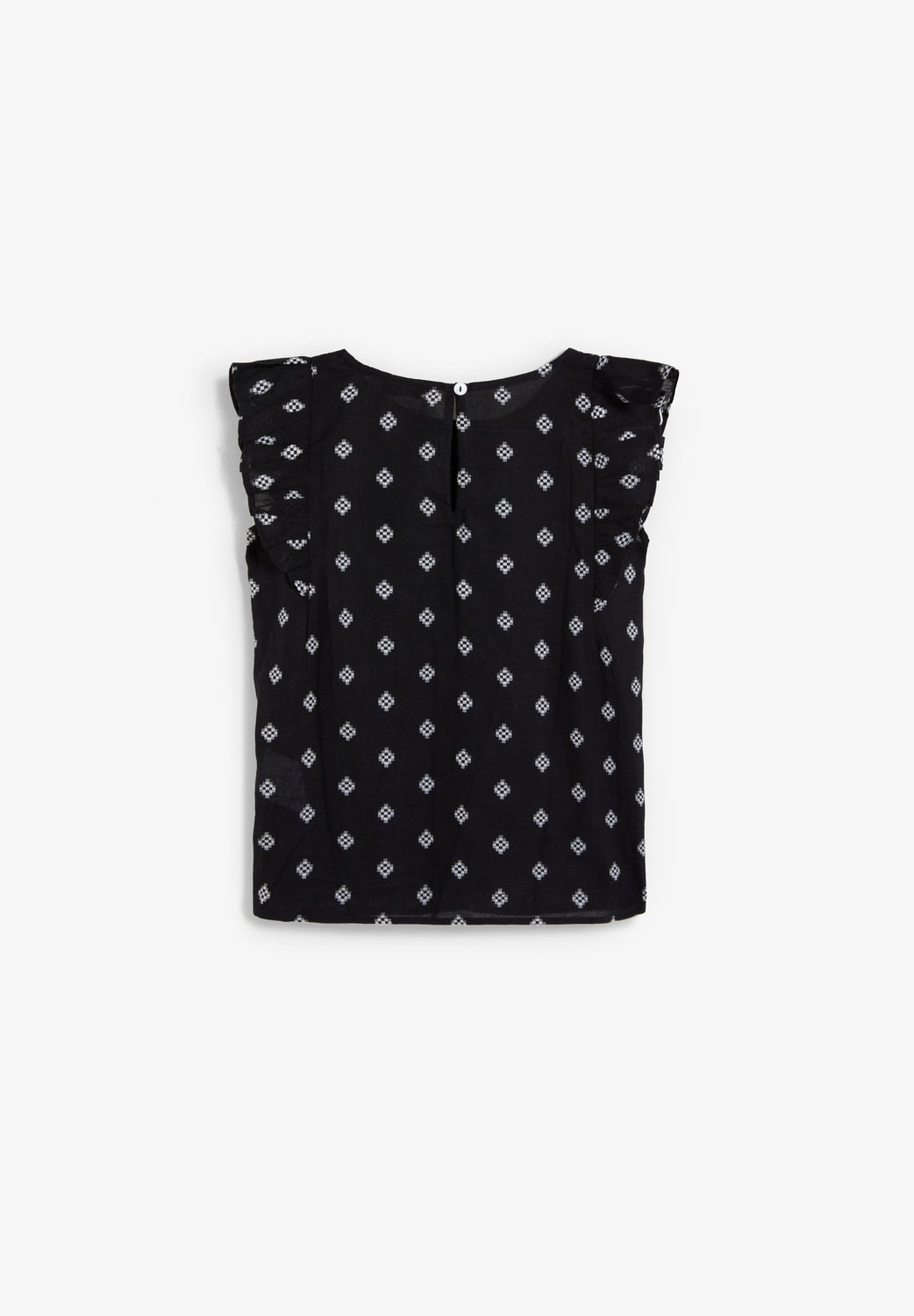 Printed blouse made of 100% cotton. Round neck, sleeveless with ruffles on the armholes. Button fastening at the back.