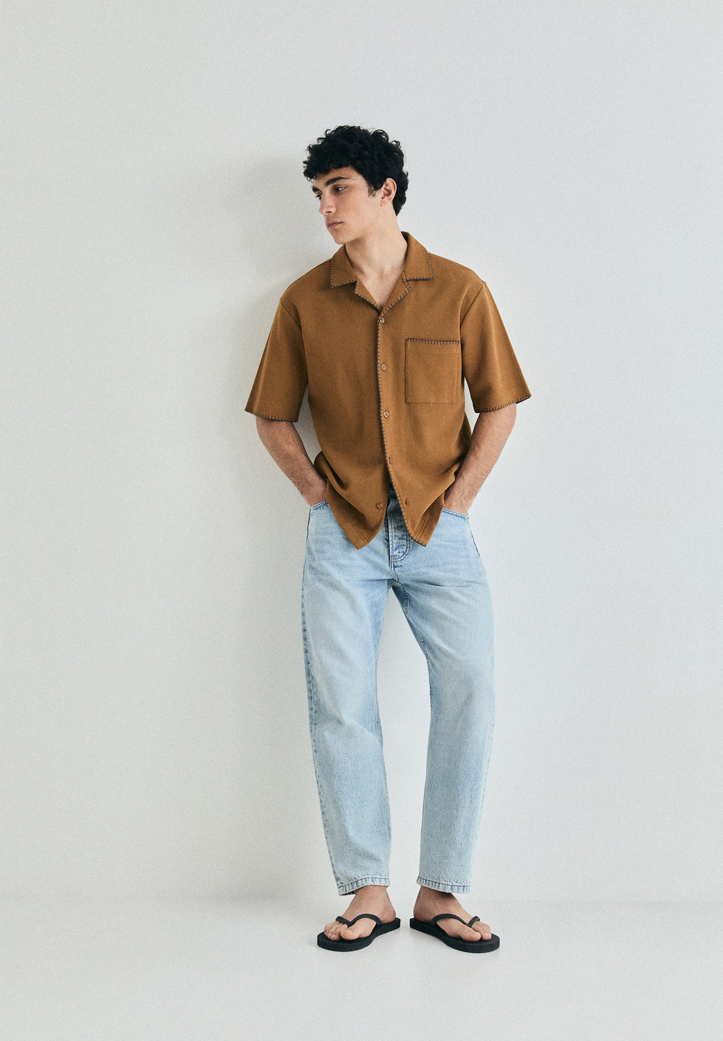 Shirt made of a cotton blend. Slim fit. Shirt collar and short sleeves. Front button fastening. Patch pocket on the front. Contrast piping.