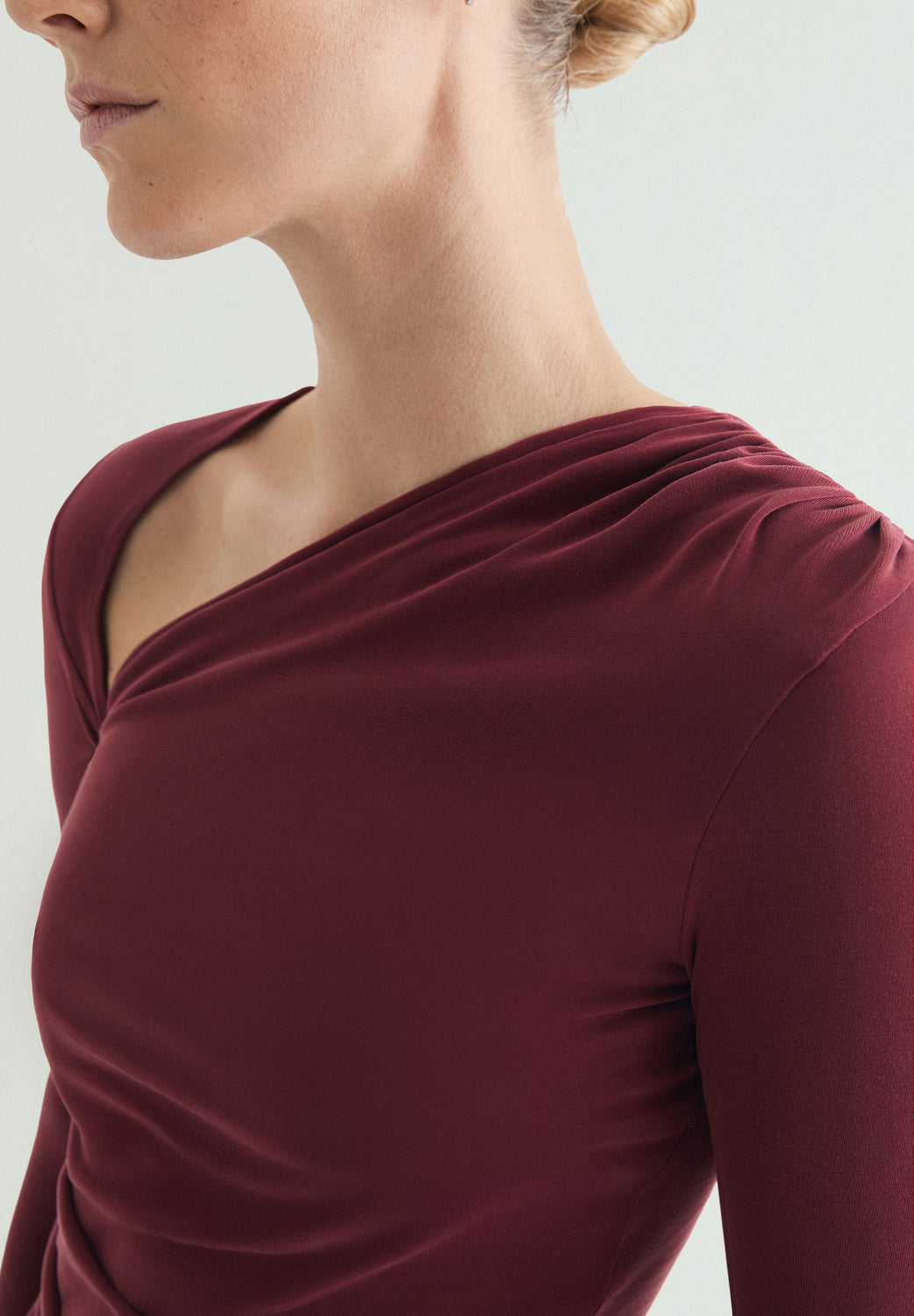 T-shirt made of cupro with a fluid drop. Slim fit, asymmetrical neckline, gathered details on shoulder and waist. Long sleeves.