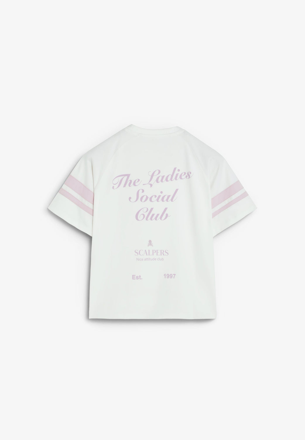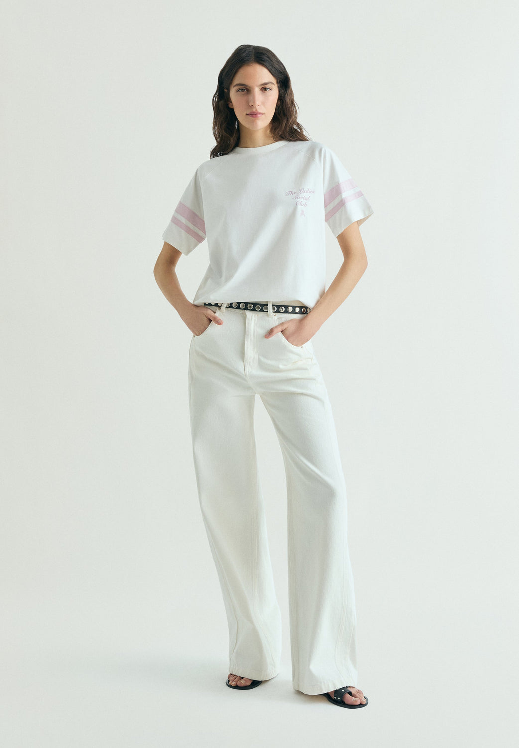 T-shirt made of 100% BCI cotton. Regular Fit. Round neck and short sleeves. Back and chest print. Striped detail on the sleeves. Ribbed collar.