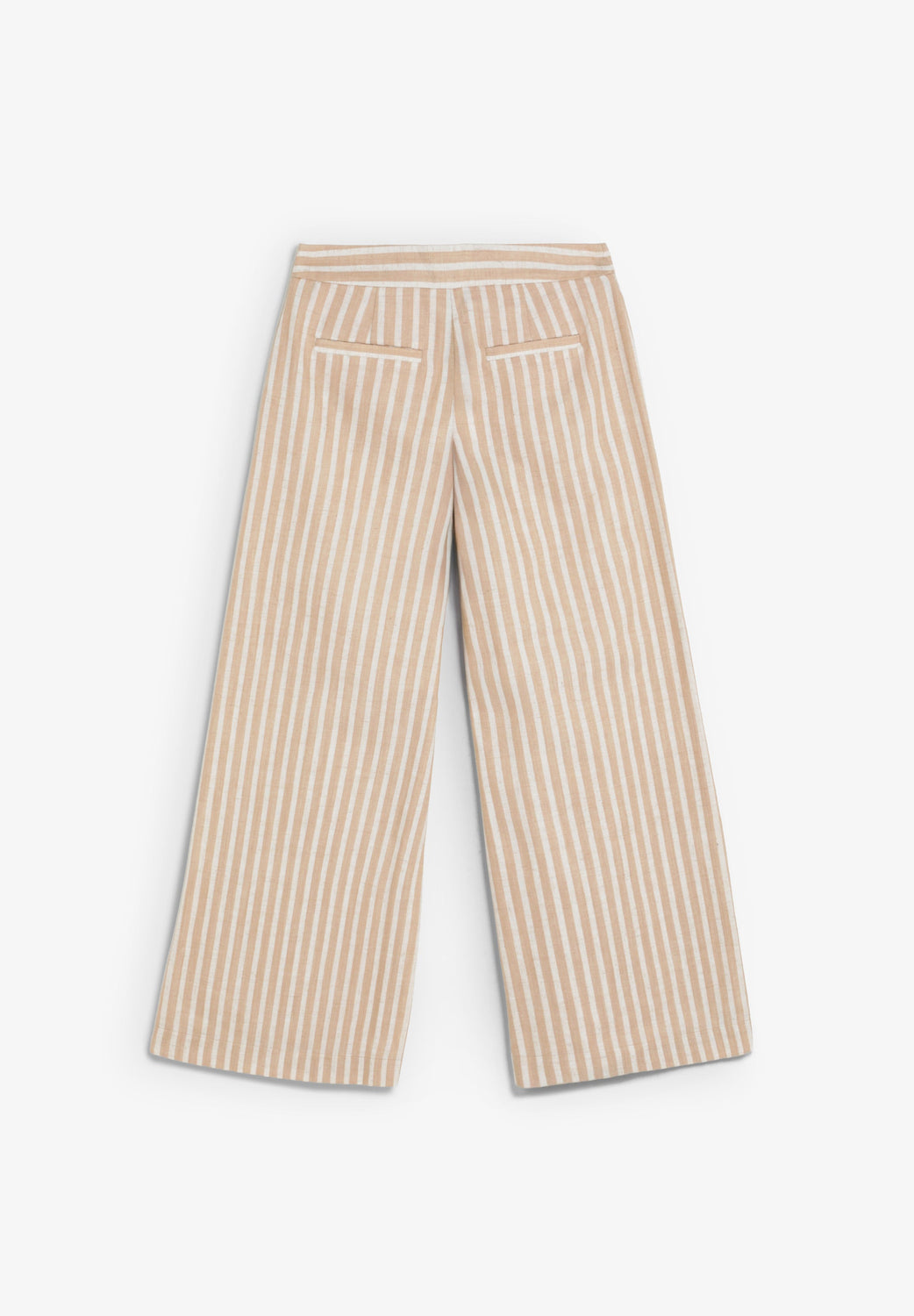 Trousers made of a linen blend. Straight cut, loose fit. Stripe print. Flap pockets. Zip and button fastening. Back welt pockets.
