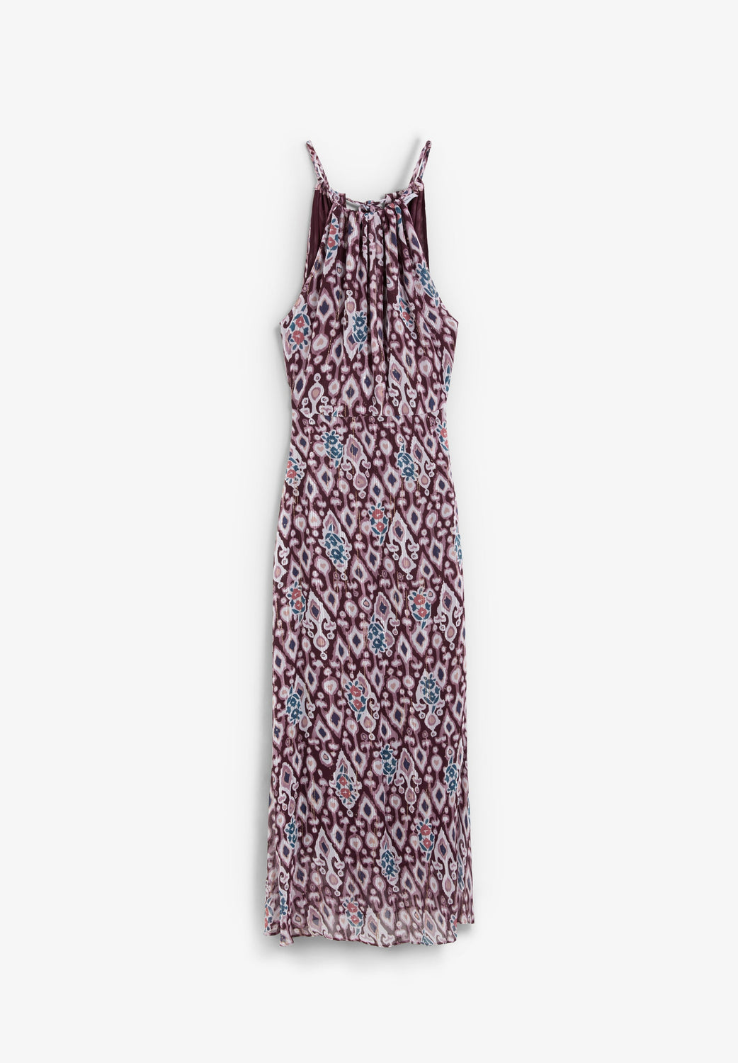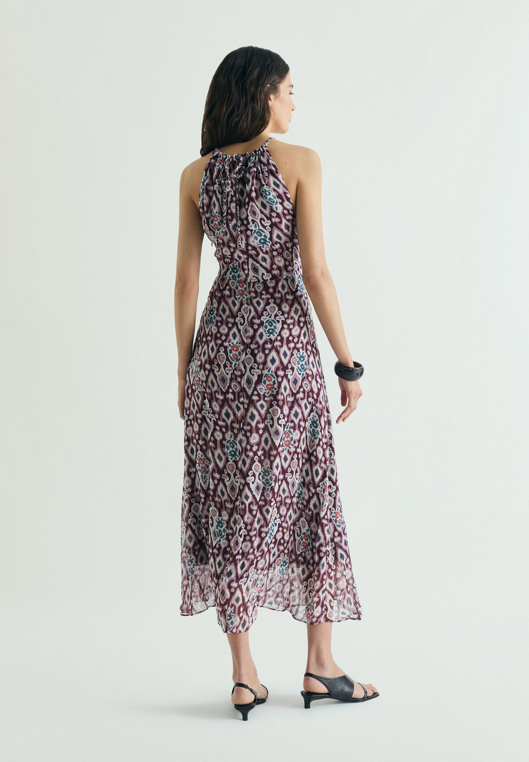 Dress made of flowing fabric with metallic thread. Halter neck, front opening on the neckline. Midi length. Multicoloured print. Adjustable braided lacing at the back. Concealed side zip fastening.