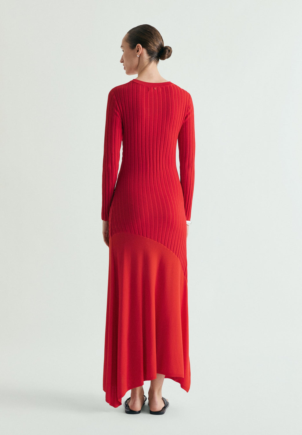 Slightly stretchy knit dress with contrasting knitted details in a monotone stripe print. Slim fit, round neck and long sleeves.