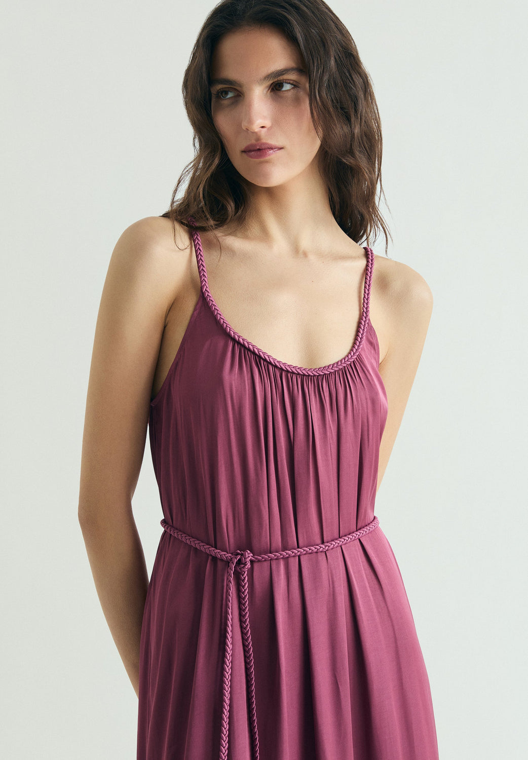 Flowing midi dress with straps. Round neck. Braided detailing on neckline and waist. Gathered ruffle on the hem.