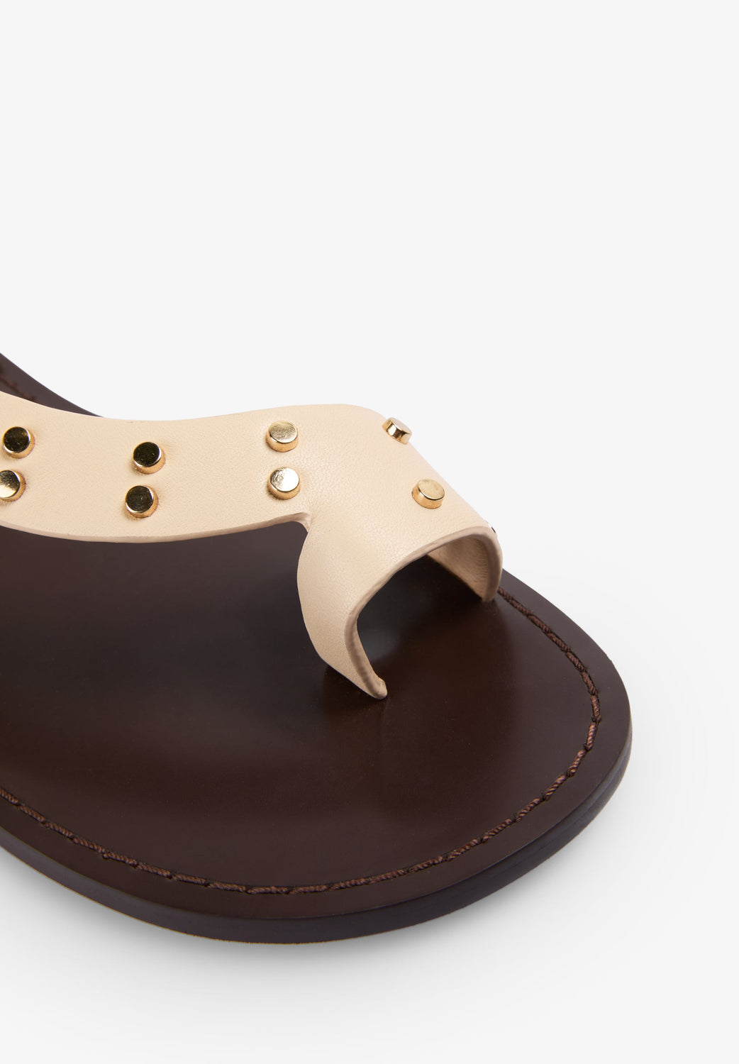 Sandals made of 100% leather with decorative studs. Ankle buckle fastening. Flat rubber sole.