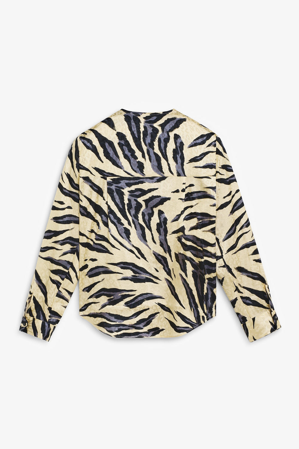 Blouse made from flowing satin fabric with animal print. Regular fit, V-neckline and button fastening. Long lightly puffed sleeves with cuffs.