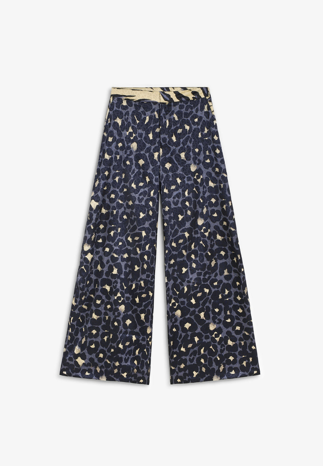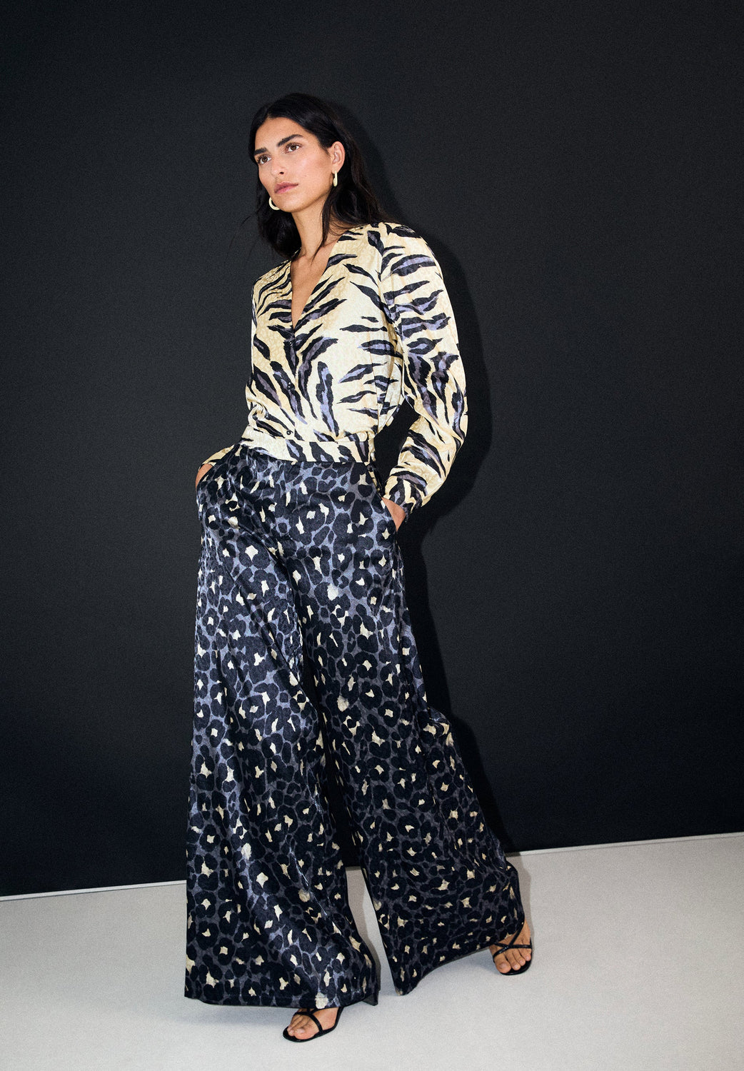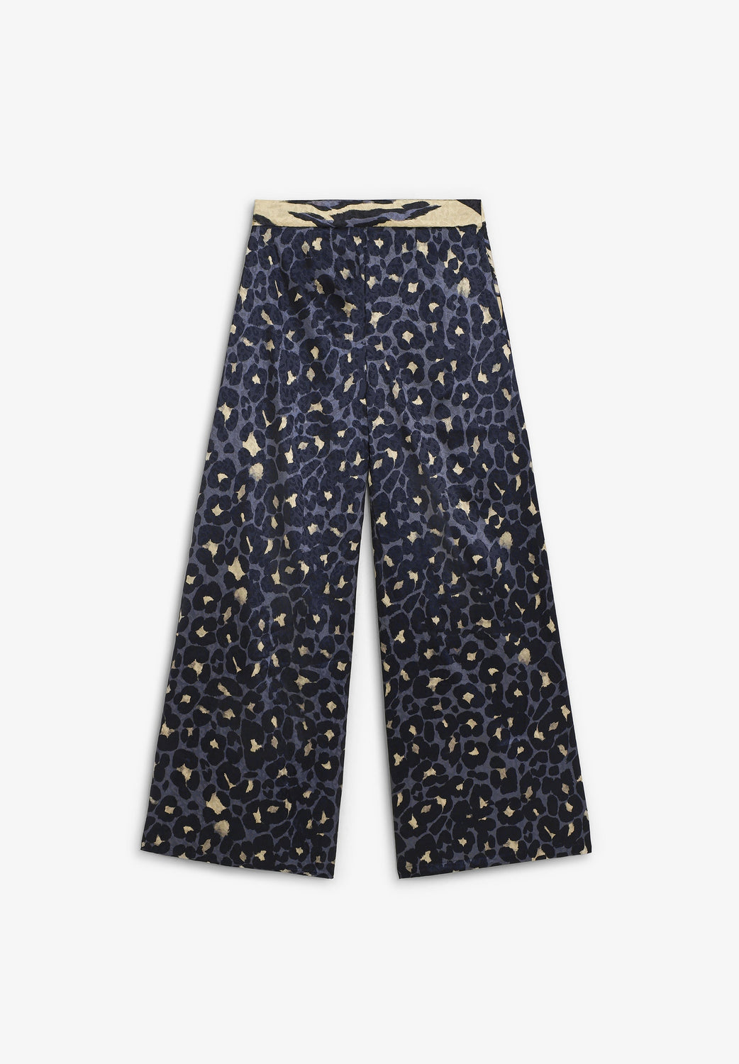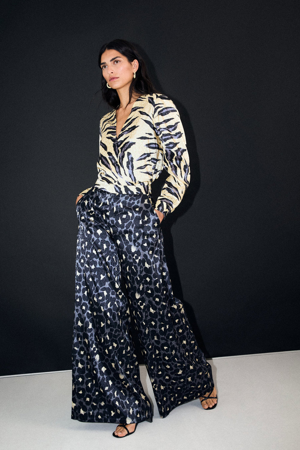 Flowing trousers. Zip fastening concealed by a placket with hook and button. Elastic waistband. Two side pockets. Animal print. Flowing fabric with satin finish.