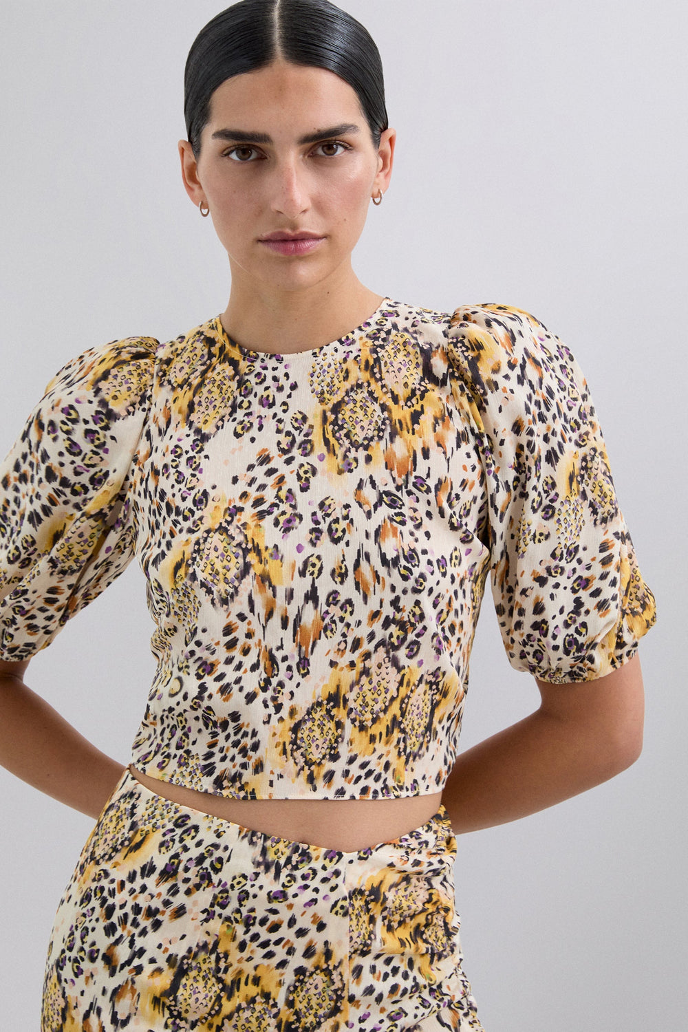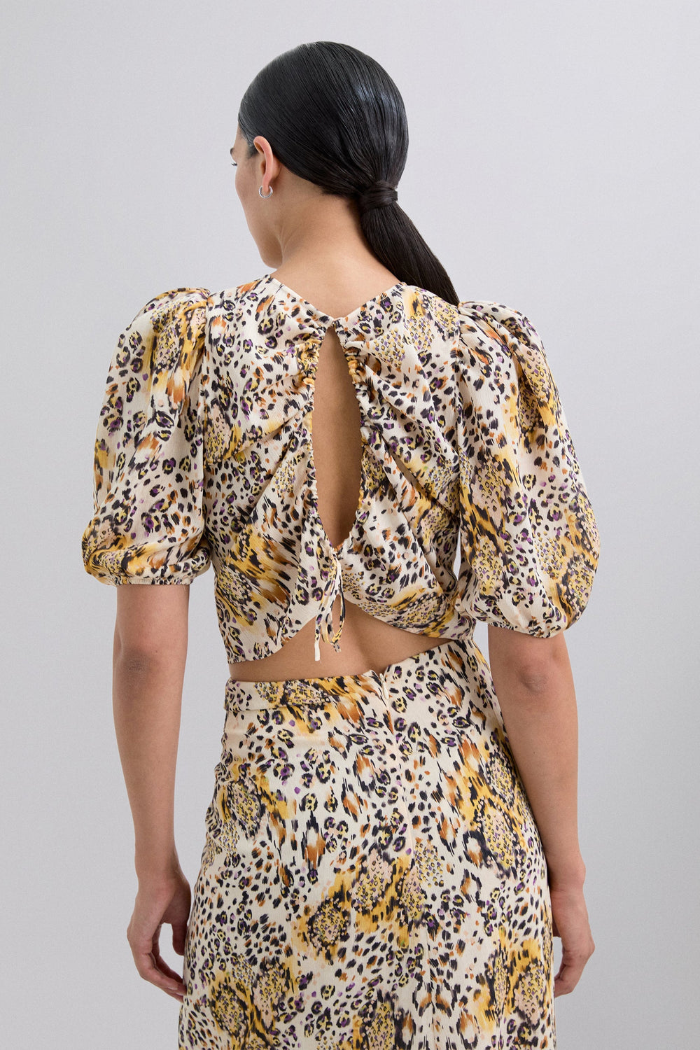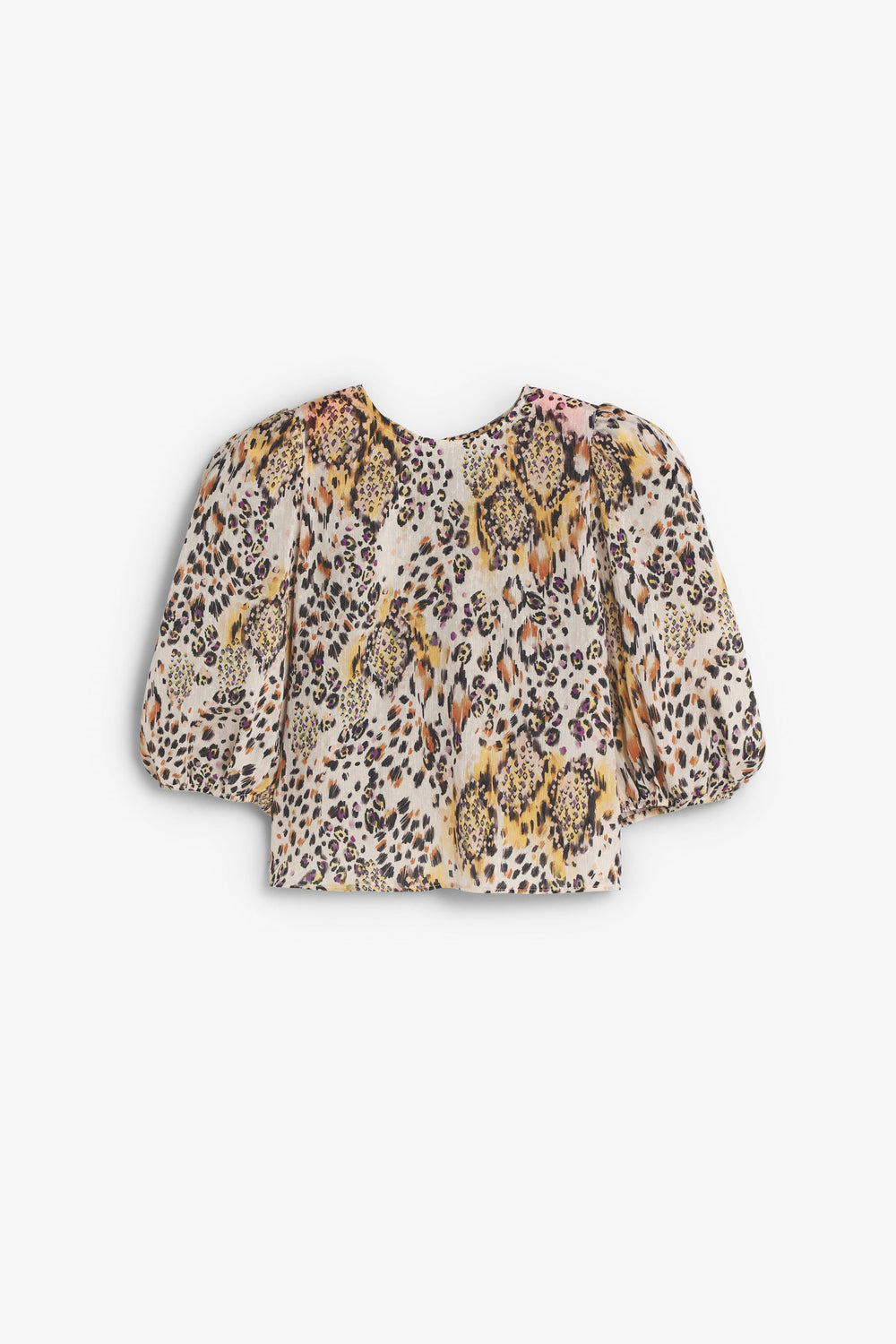 Animal print top. Round neck and short slightly puffed sleeves. Lace-up fastening at back.