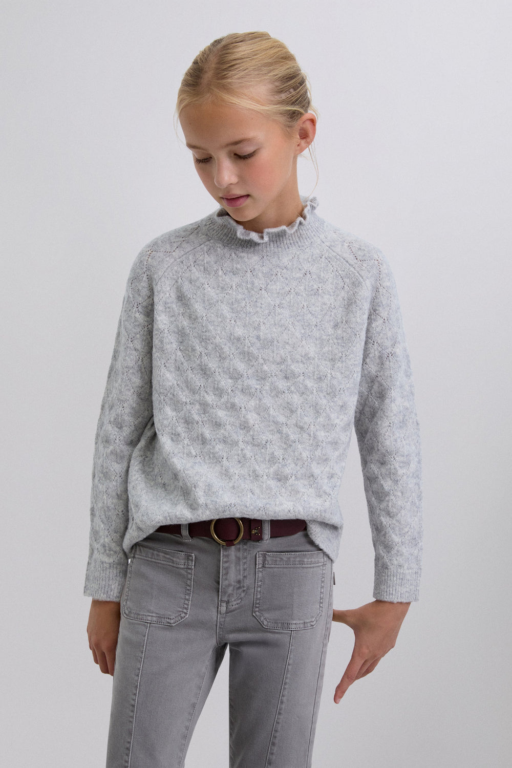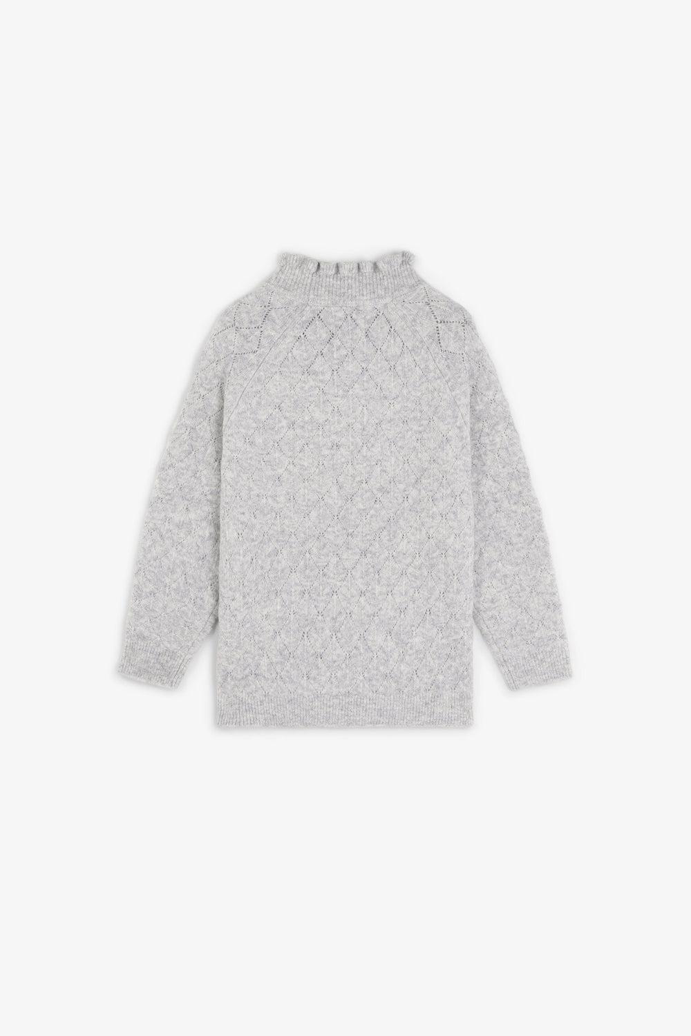 Knit sweater made of a merino wool blend. High neck with ruffles. Long sleeves with ribbed cuffs. Perforated diamond pattern.