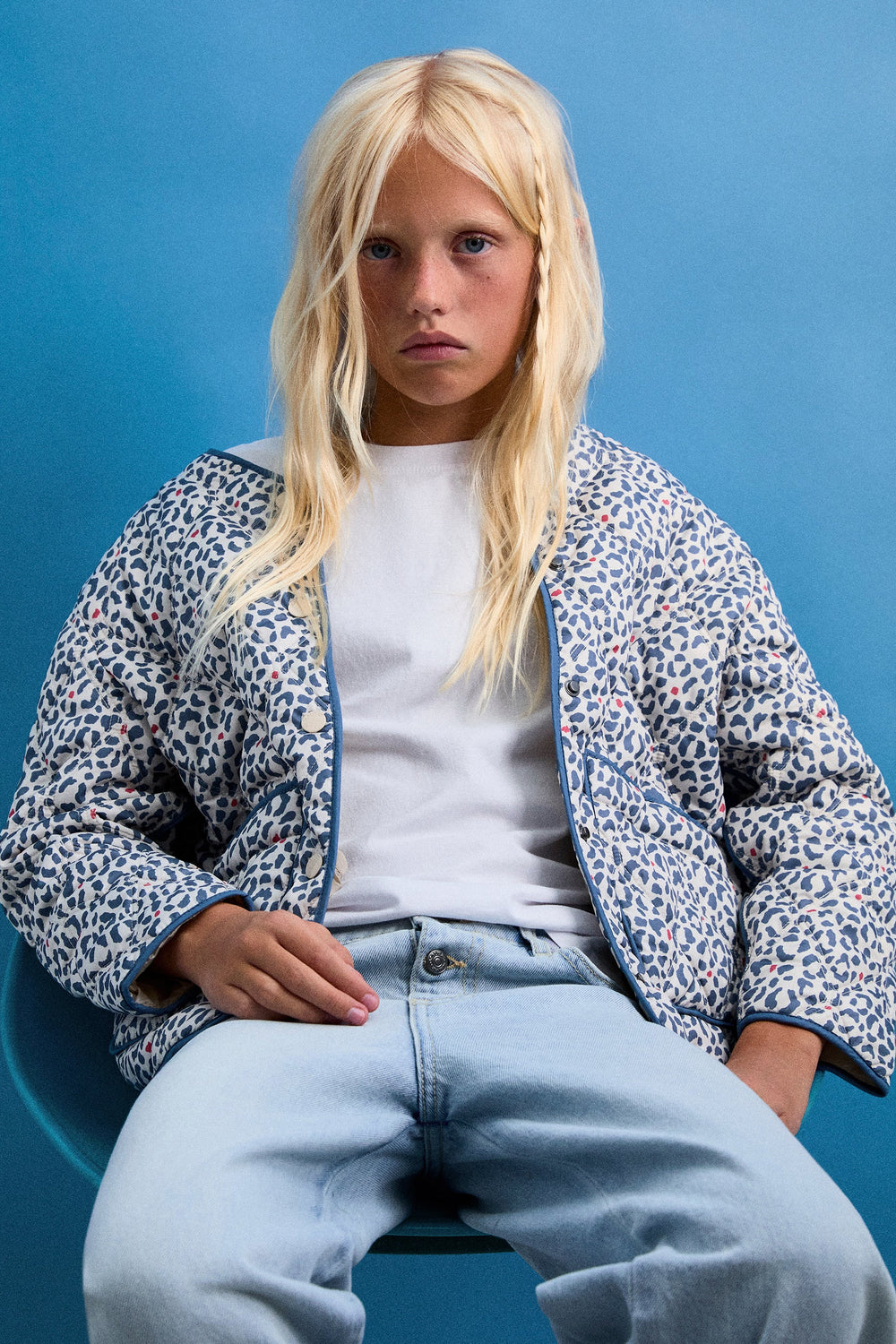 Puffer jacket made of a synthetic blend. Animal print. Button fastening. Slightly V-neck. Long sleeves. Two front pockets.