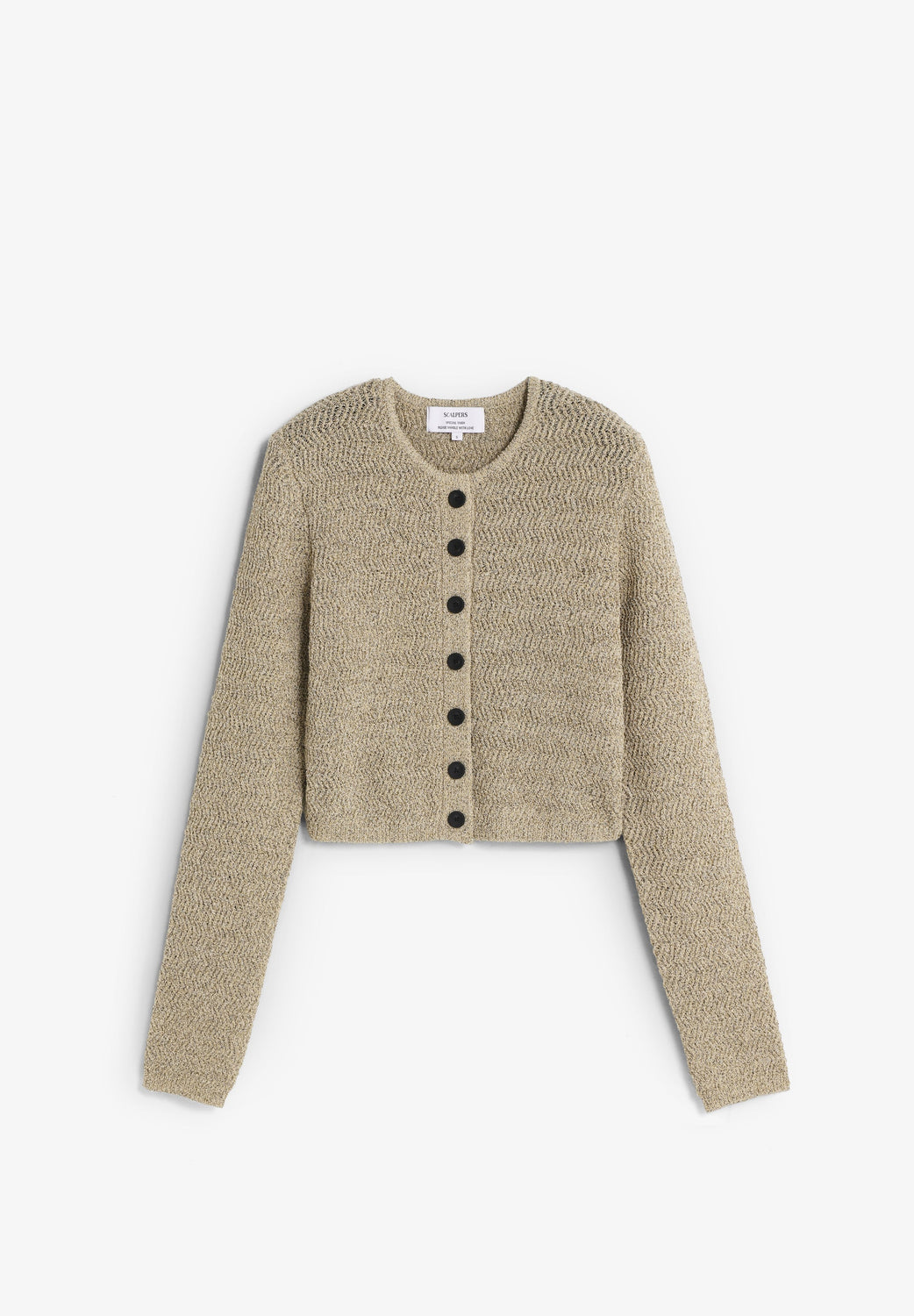 Knit cardigan. Round neck. Long sleeves. Contrast front button fastening.