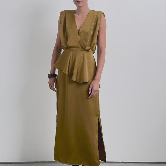Top made of stretchy fabric with texture. Regular fit, V-neck, sleeveless design with slightly padded shoulders. Pleated at the bust, gathered waist and ruffle on the hem.