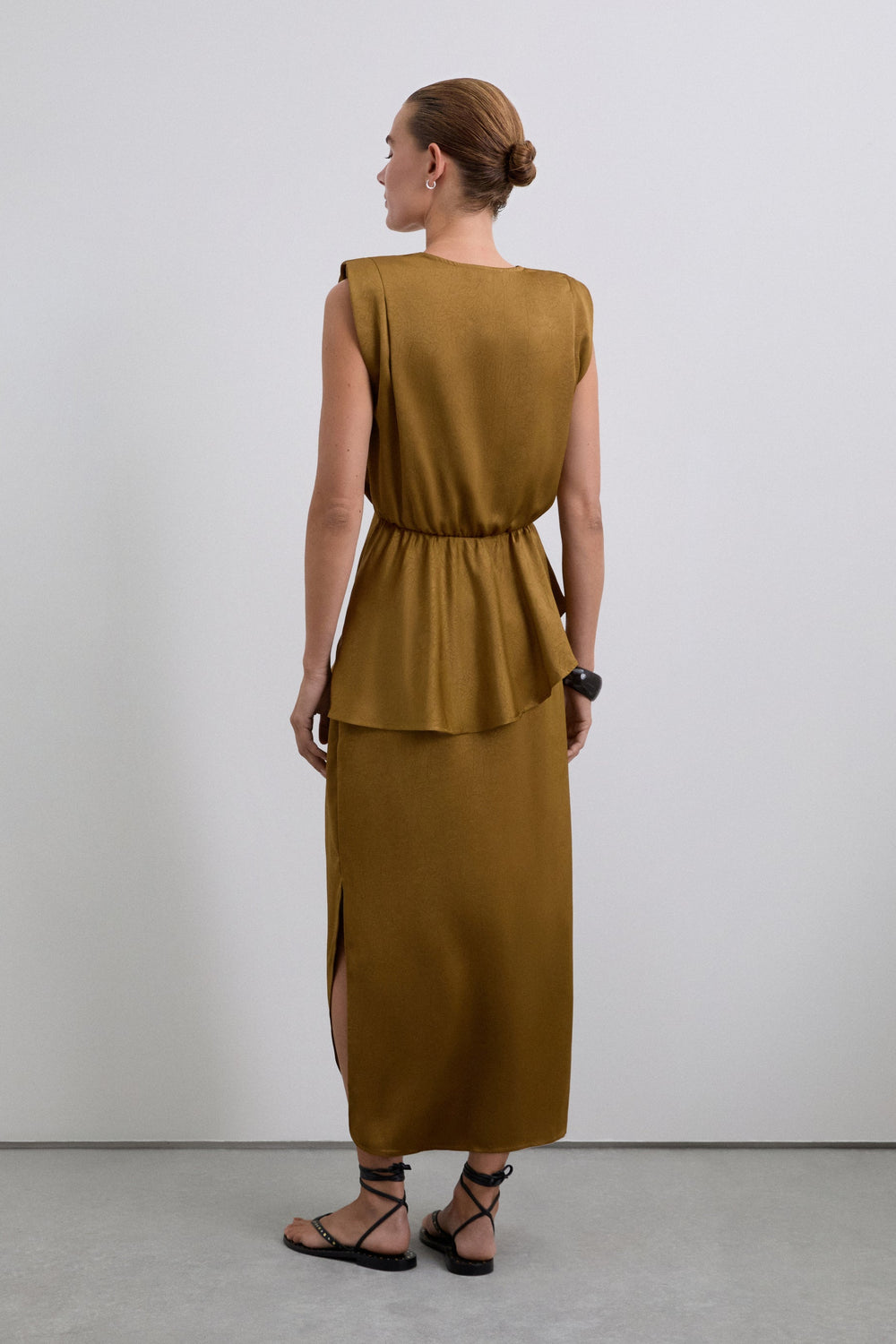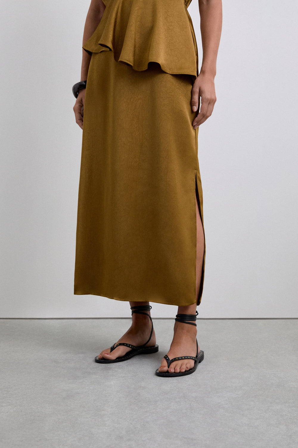 Midi skirt made of flowing fabric with texture. Concealed side zip fastening and split leg.