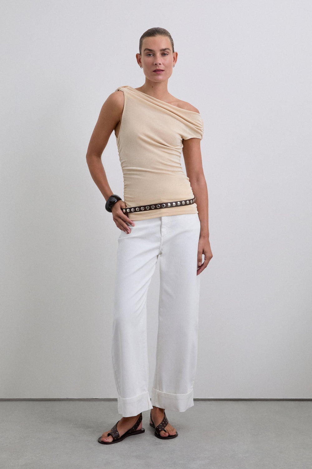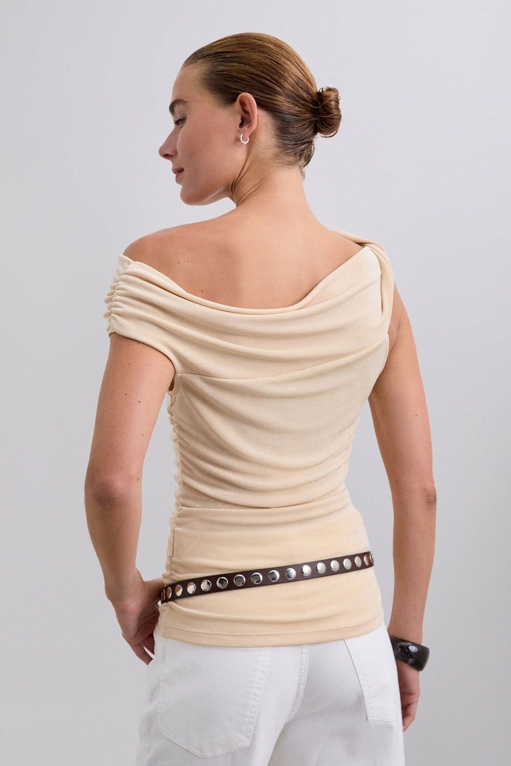Top made of slightly stretchy fabric. Slim fit, Off The Shoulder, asymmetric neckline with gathers on the sides.
