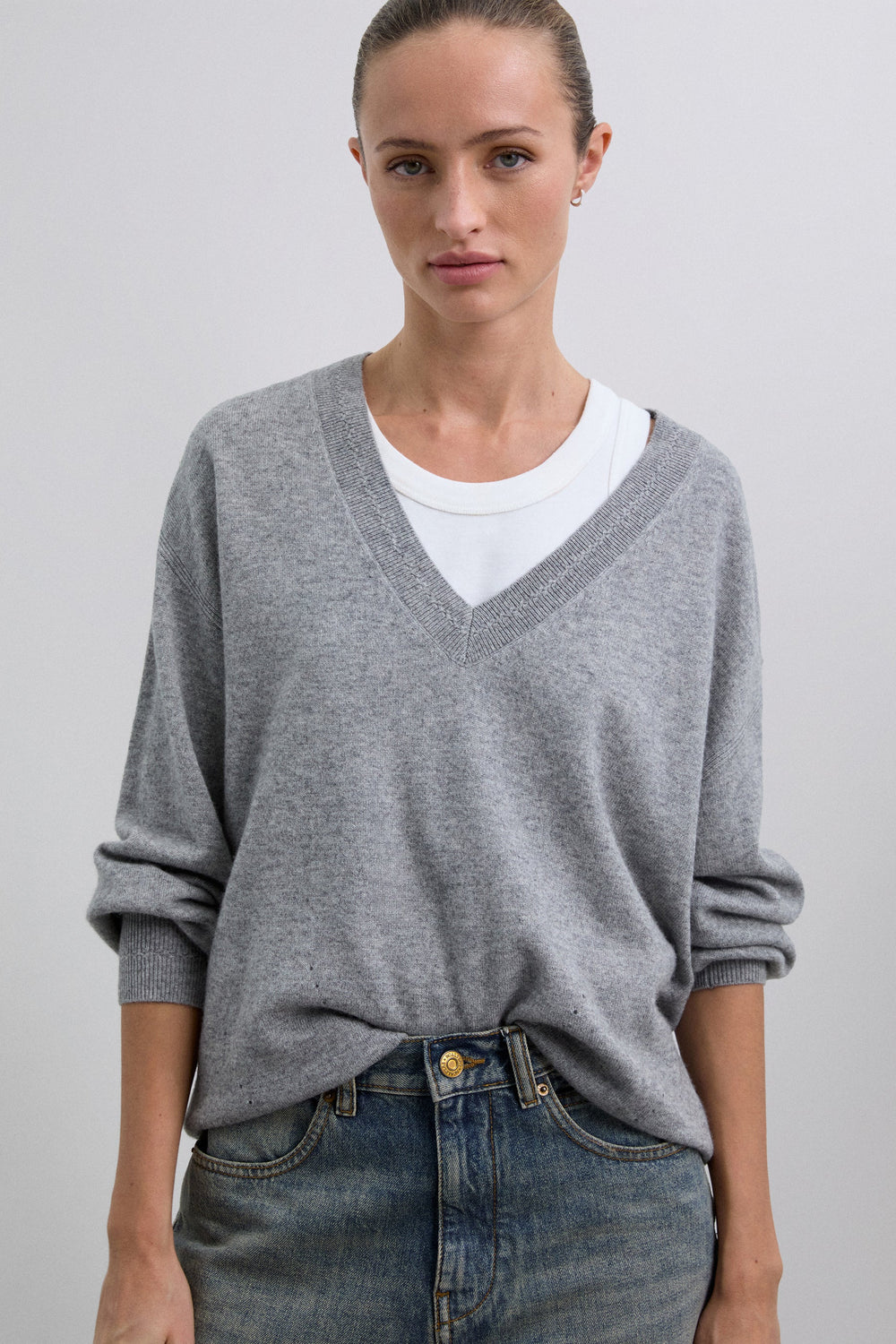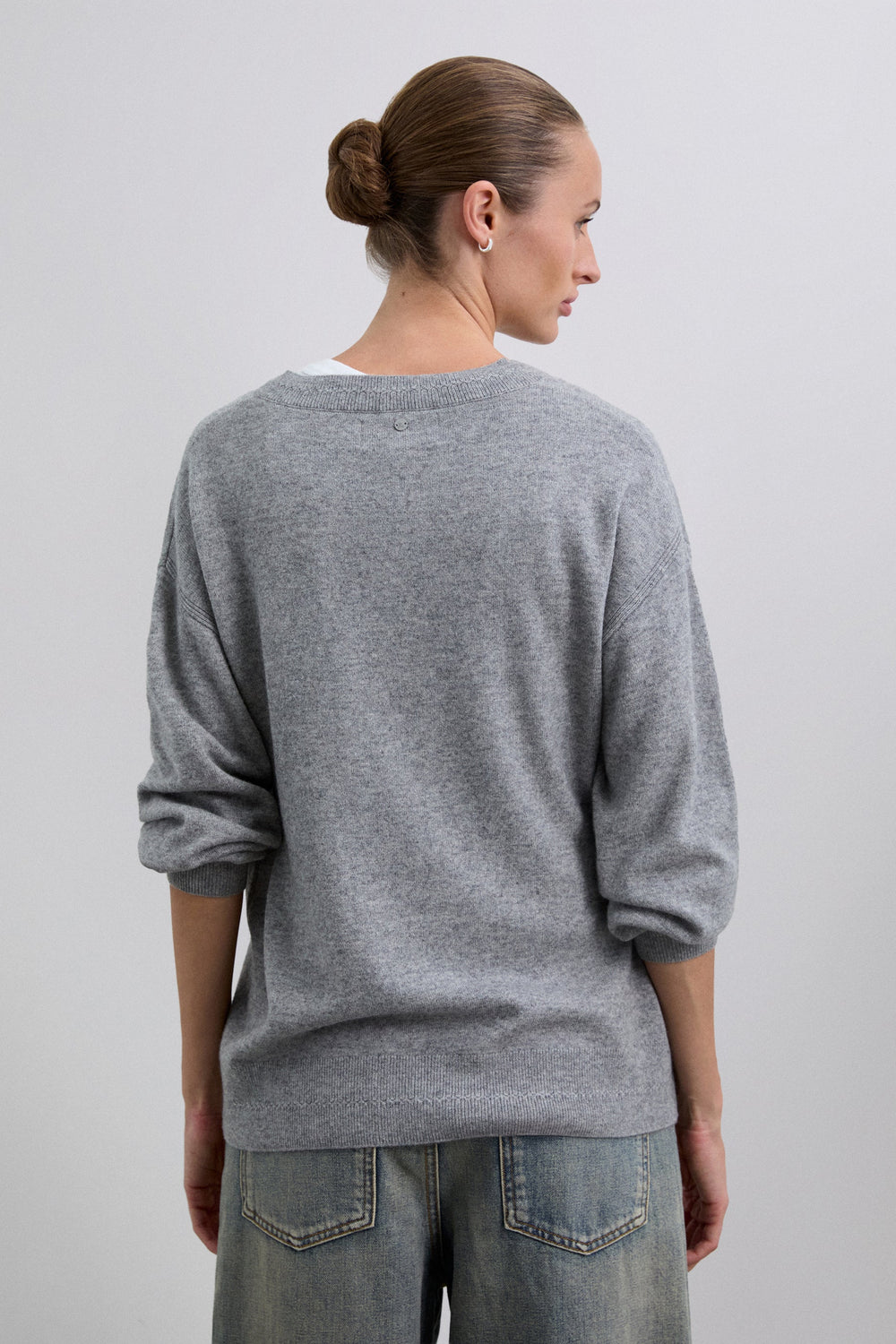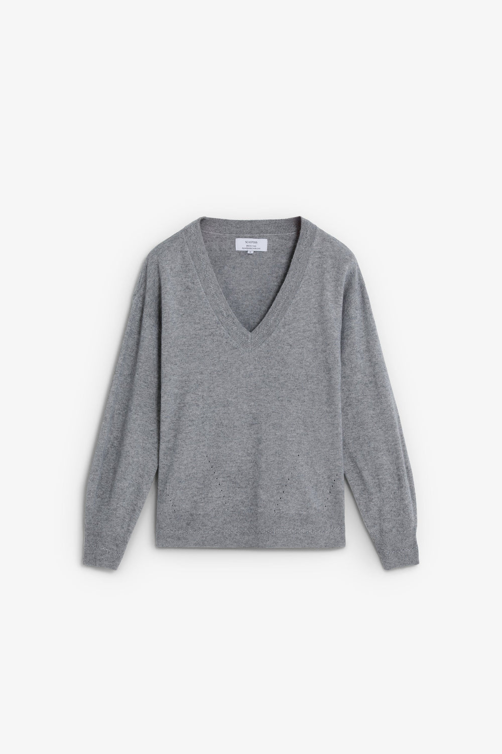 Sweater made of wool. V-neckline with a slightly loose fit. Mini hole details near the top hem. Ribbed finish on collar, cuffs and belt. Metal logo plate detail on back.