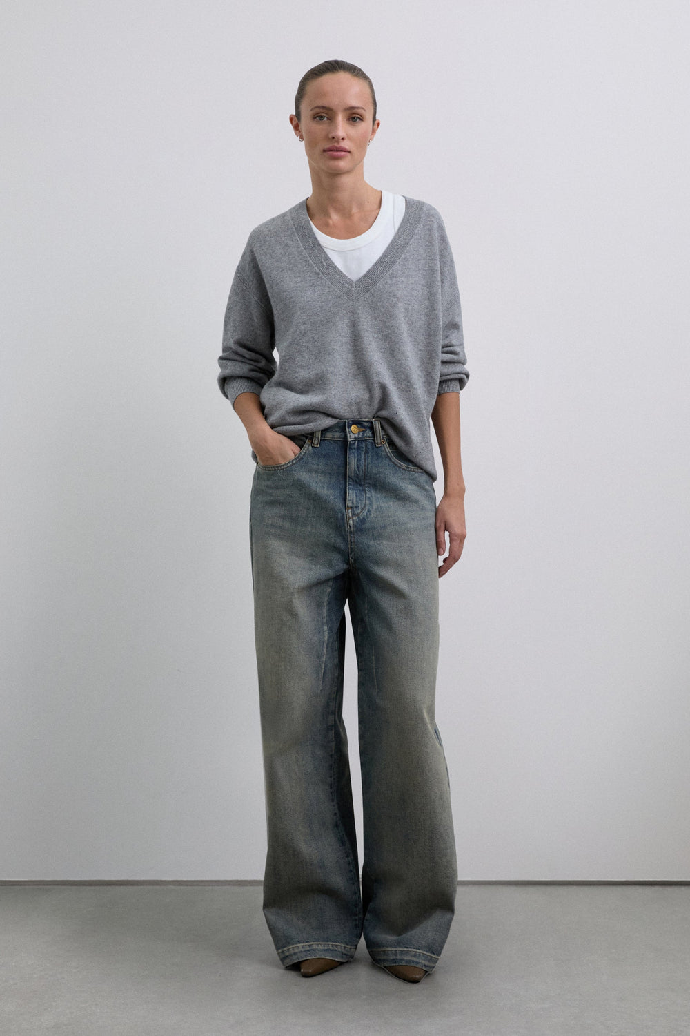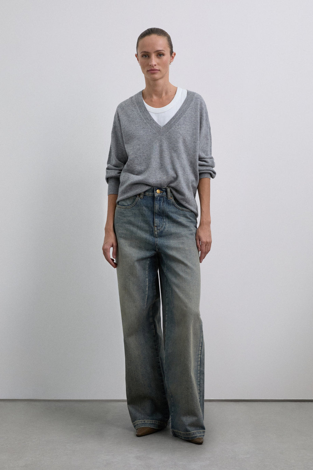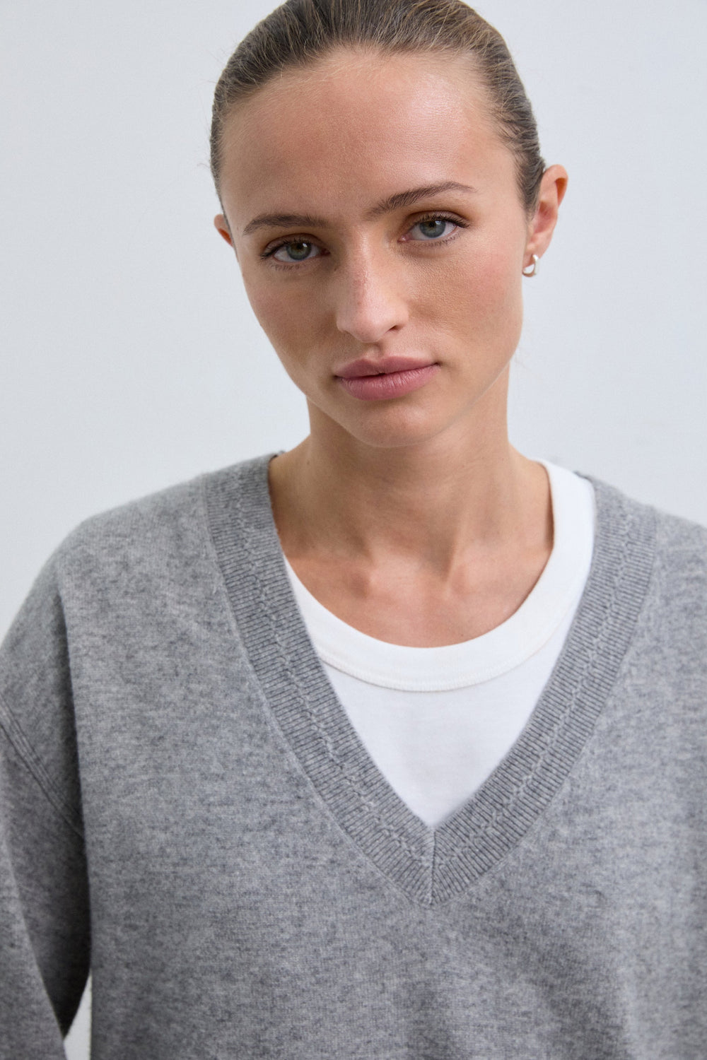 Sweater made of wool. V-neckline with a slightly loose fit. Mini hole details near the top hem. Ribbed finish on collar, cuffs and belt. Metal logo plate detail on back.