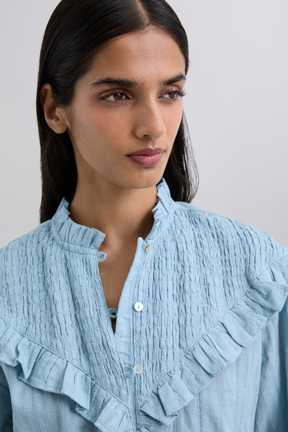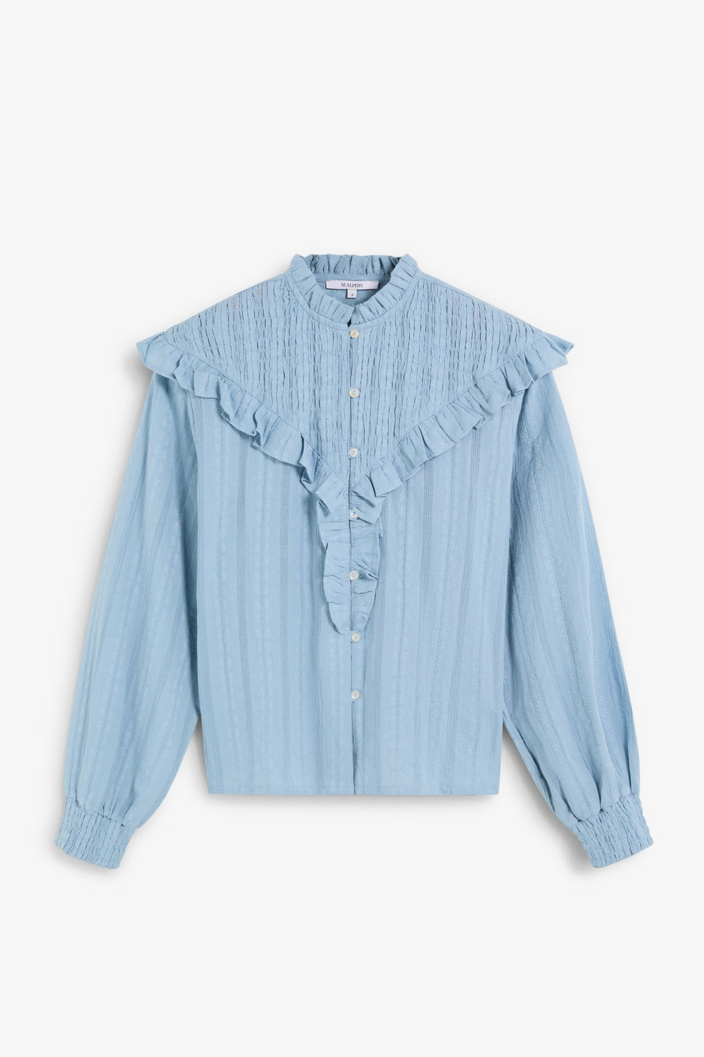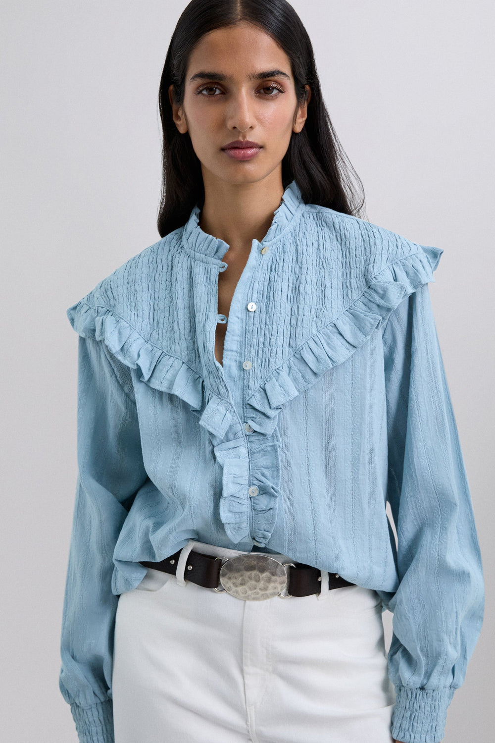 Long sleeve blouse made of 100% cotton. Classic collar and ruffle in smocked fabric. Mother-of-pearl buttons.