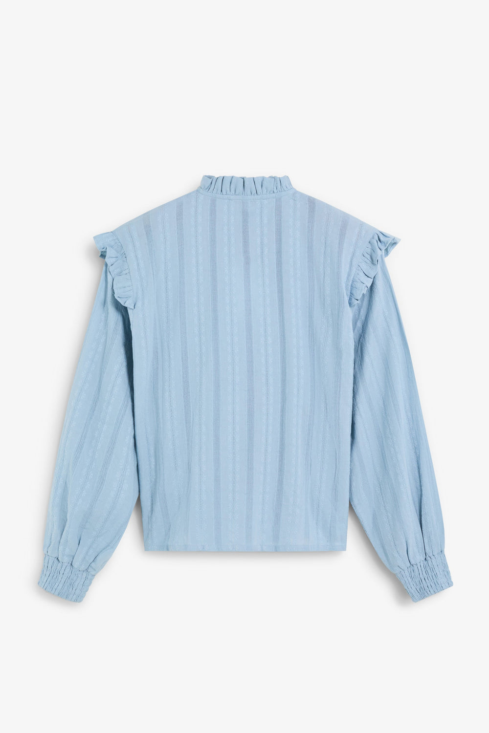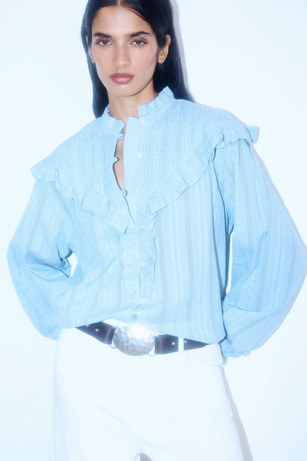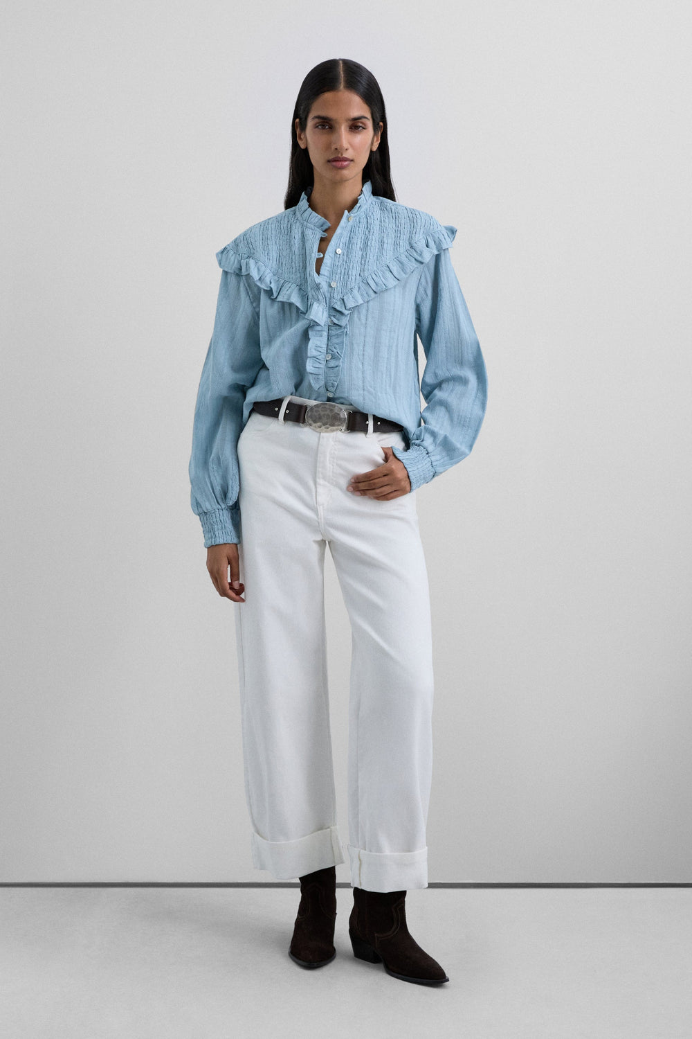 Long sleeve blouse made of 100% cotton. Classic collar and ruffle in smocked fabric. Mother-of-pearl buttons.