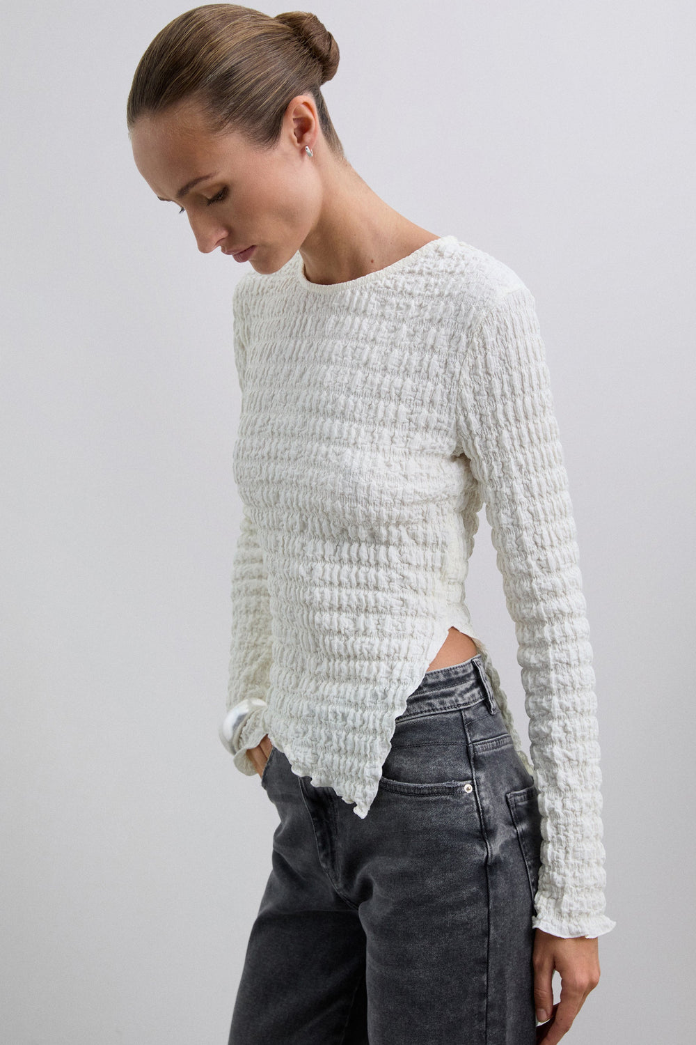 Round neck top with long sleeves. Lightweight fabric with gathered texture.