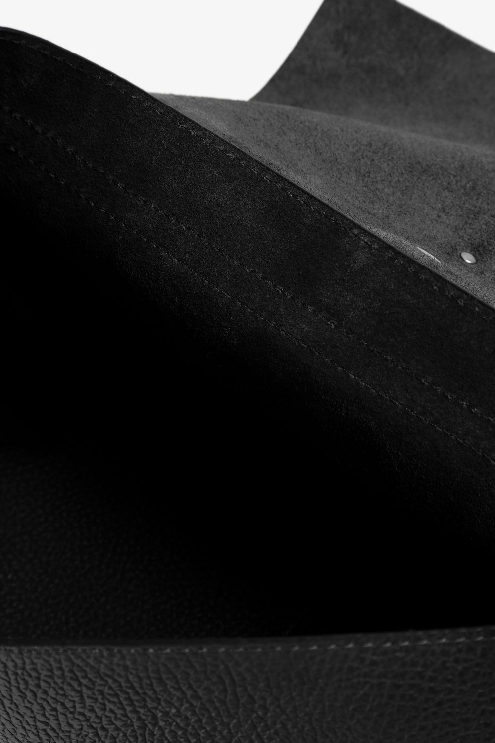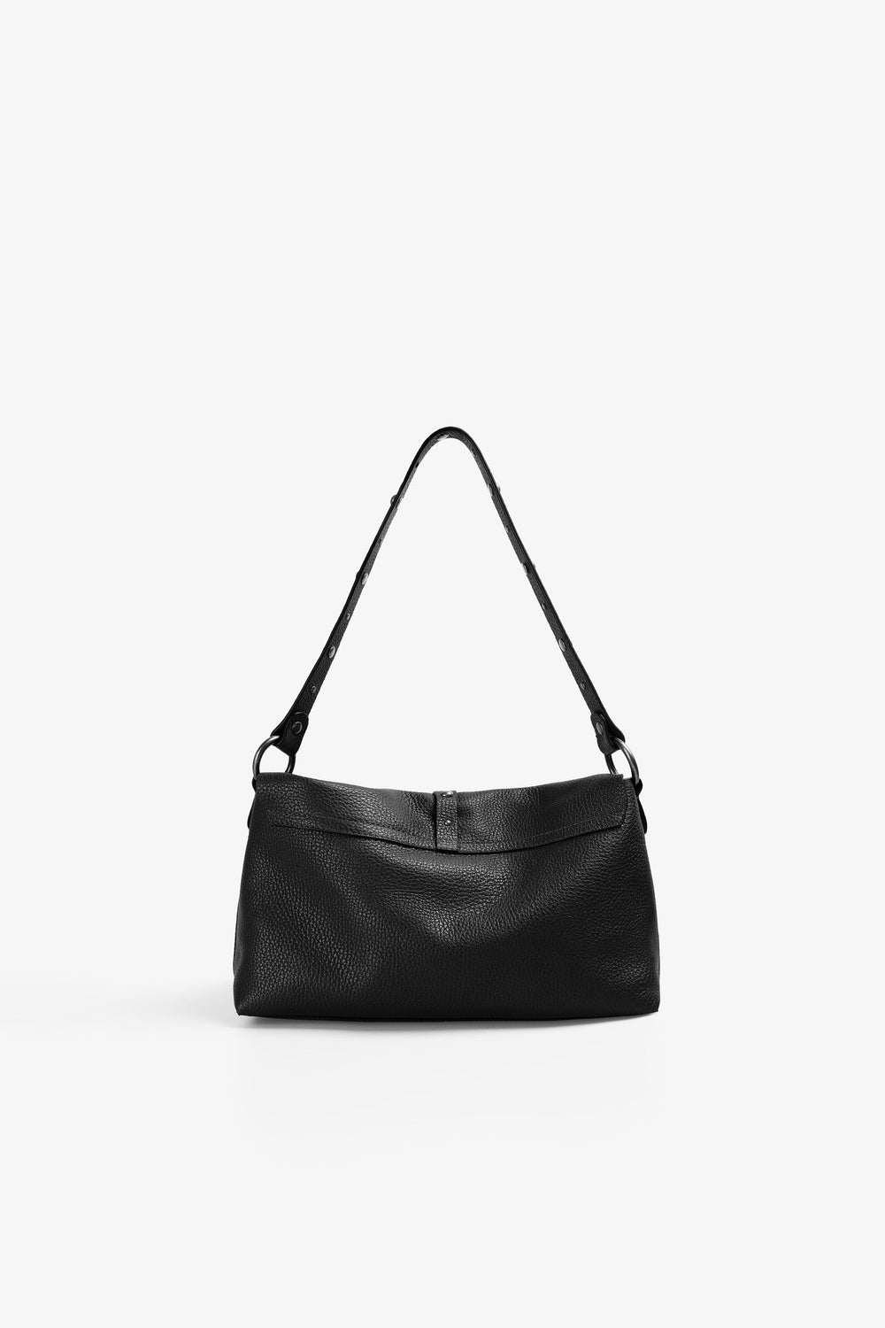 Bag made of 100% leather with stud details. Closing placket. Short handle and long strap.