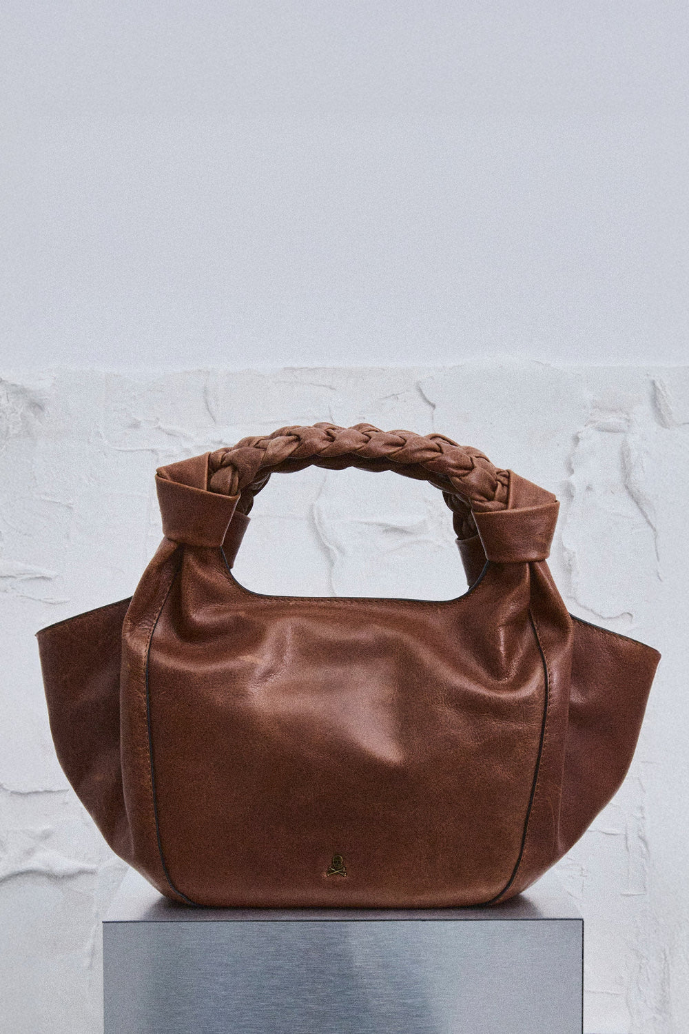 Handbag made of 100% leather with knotted braided handle detail. Lined with inner pocket, zip closure. Metal logo on the front Double handle option.