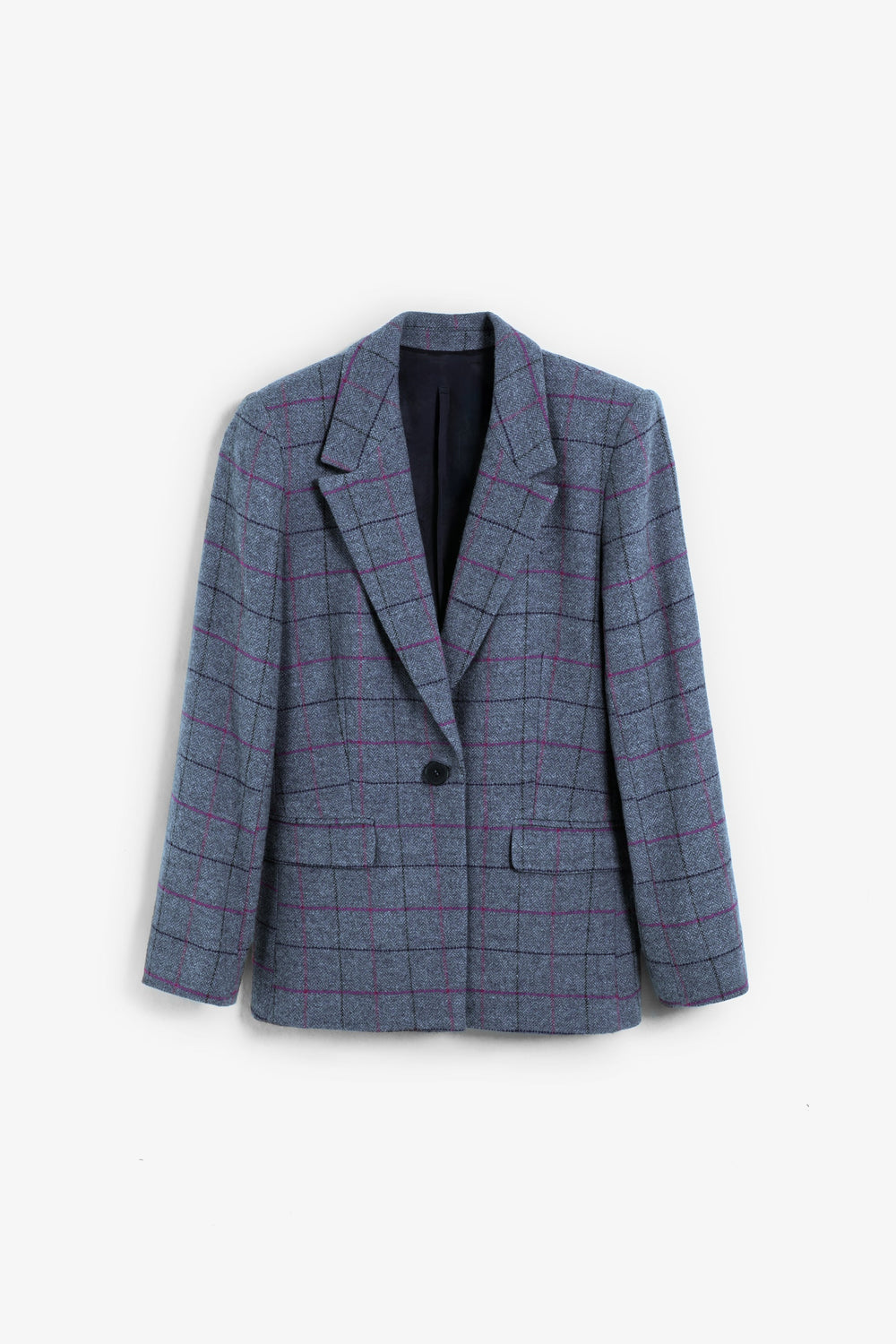 Blazer made of wool. Check print. Textured shoulder pads. Front button fastening. Two back pockets with flaps.