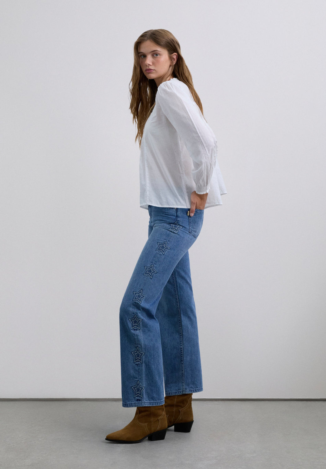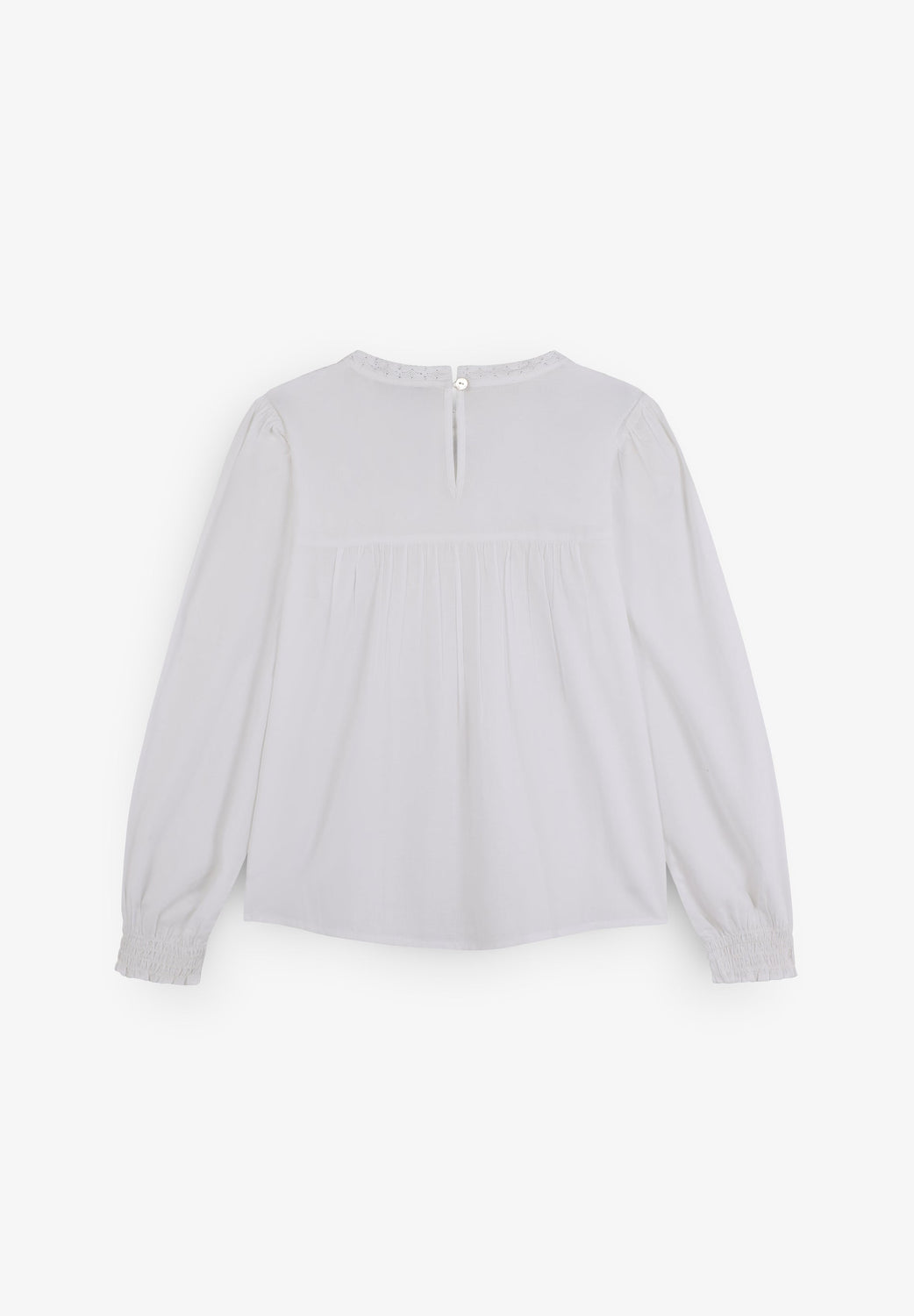 Blouse made of 100% BCI cotton. Regular fit. Round neck. Long puff sleeves with elastic trim. Metallic logo detail on waistband. Embroidered details on collar and front. Back button fastening.