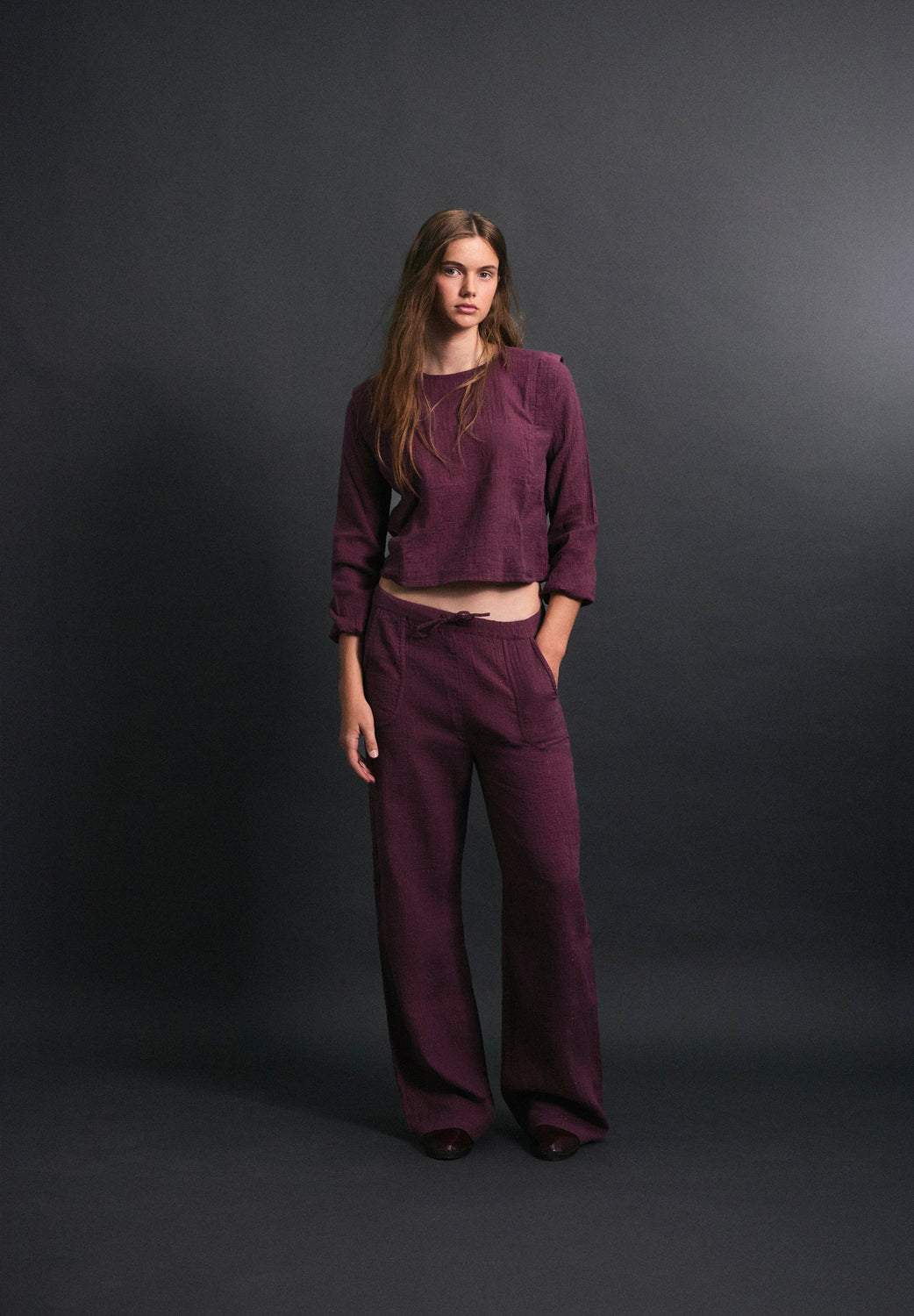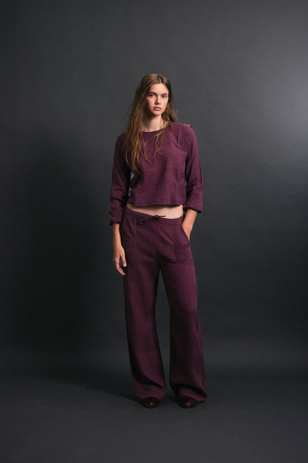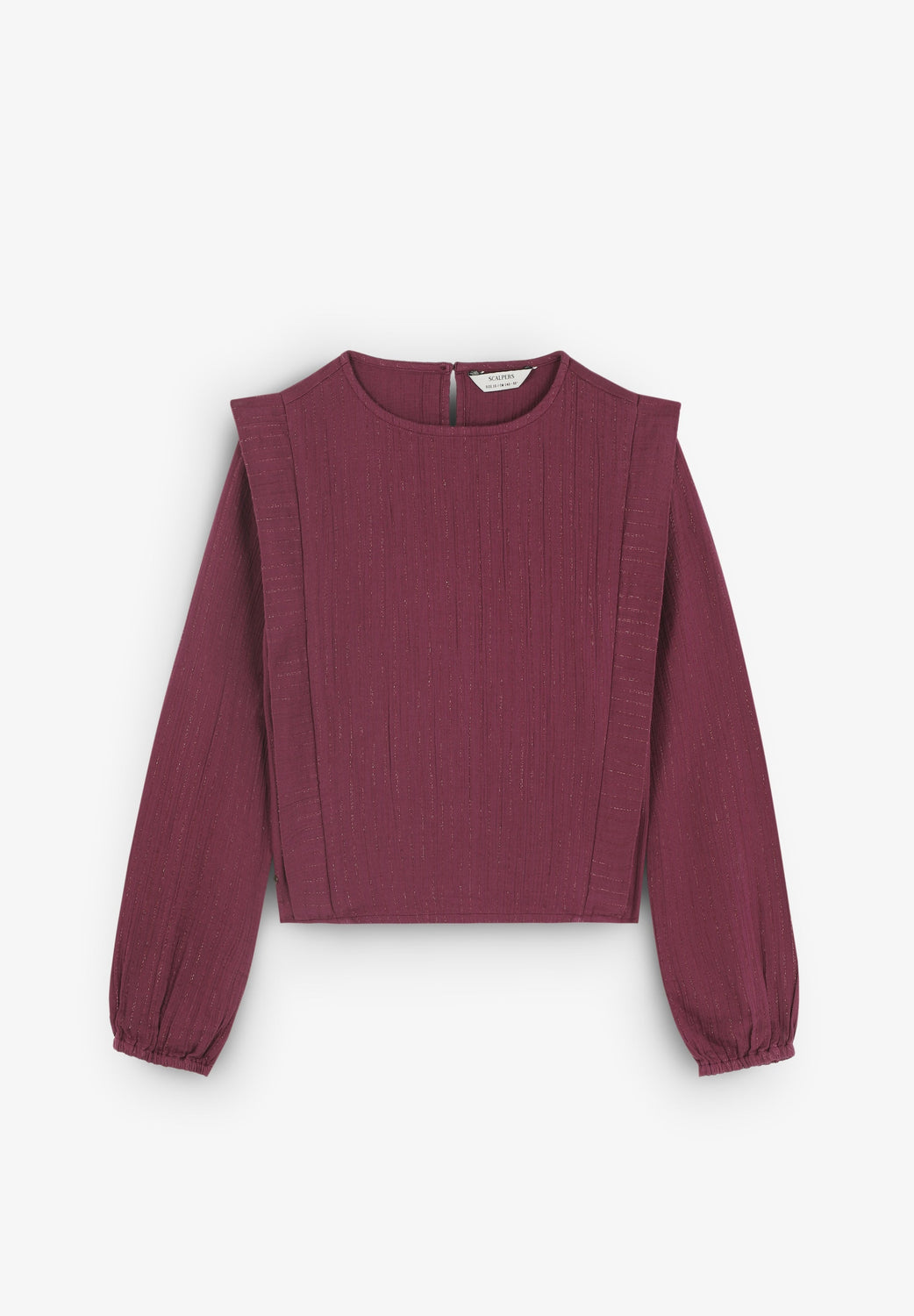 Blouse made of BCI cotton. Round neck. Front pleats. Ribbed details. Long sleeves. Elasticated cuffs. Back button fastening.