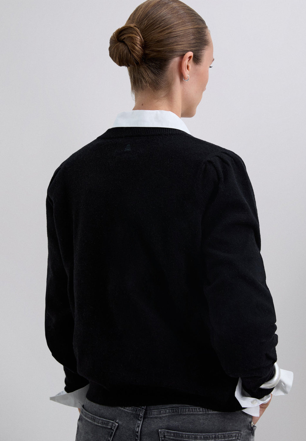 Sweater made of a wool blend with V-neck. Regular fit. Long, slightly puffed sleeves with ribbed cuffs. Matching embroidered skull detail on the back.