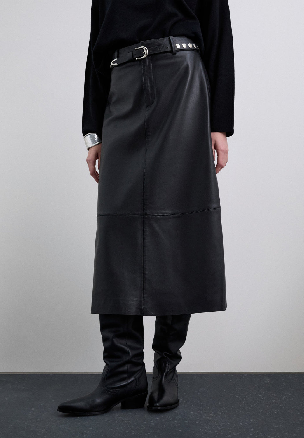 Halflange rok van leer. Rits en knoopsluiting voor. Detail in de taille voor riem. Naden.
