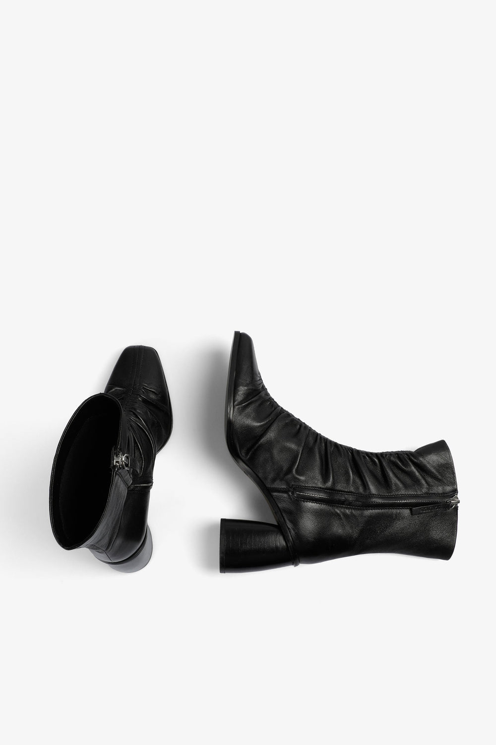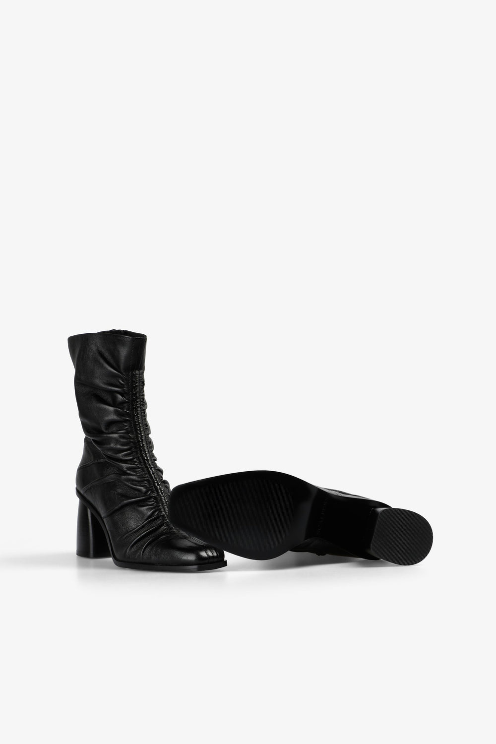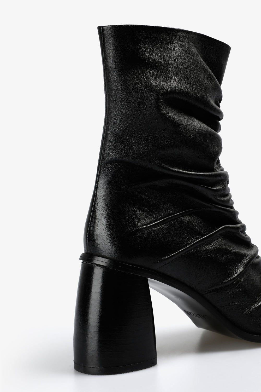 Boots made of 100% leather. Medium heel. Draped effect detailing on the centre front. Zip fastening. Embroidered logo detail on the zip. Heel height: 7.5 cm.