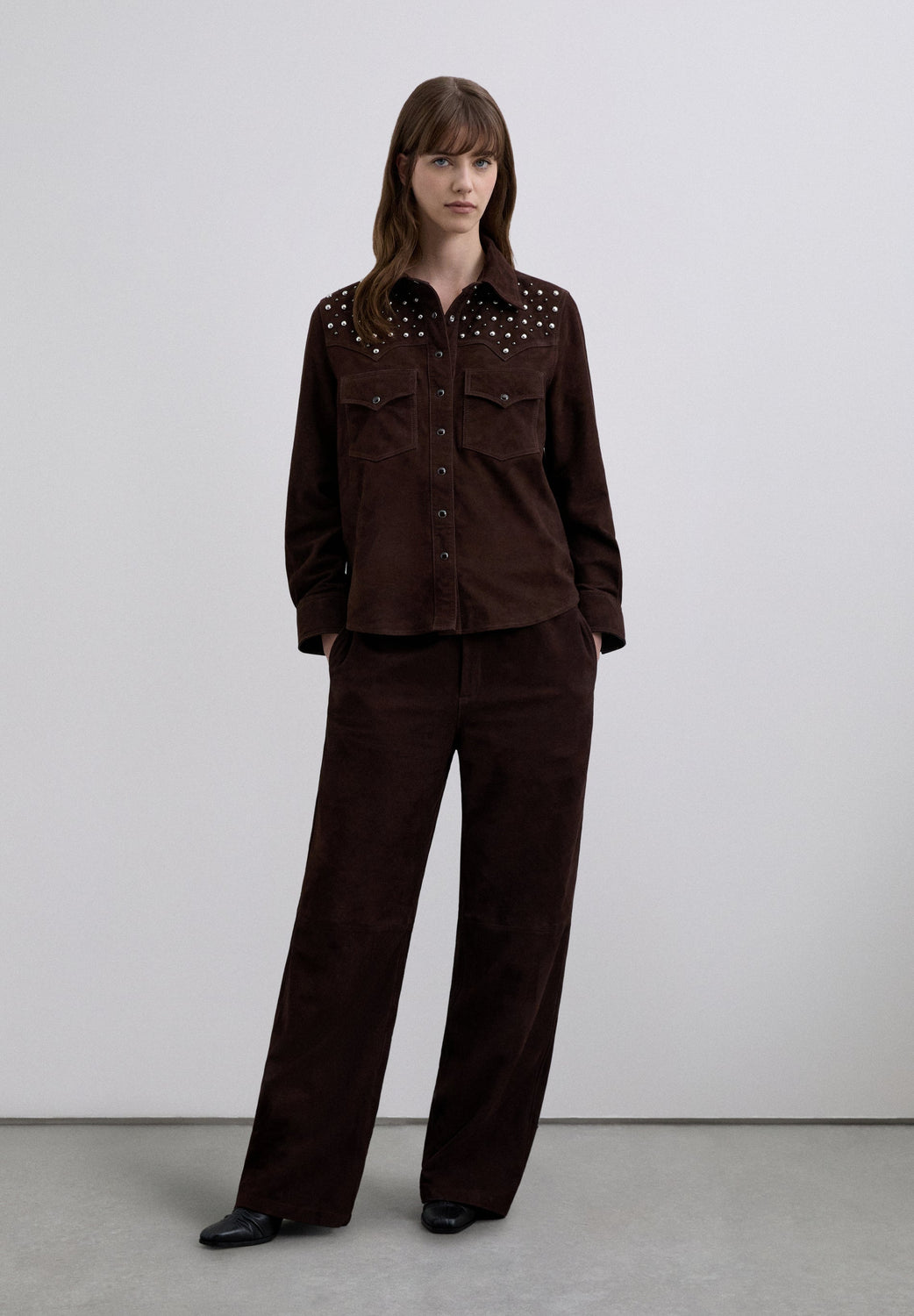 100% suede shirt. Long sleeves and button fastening on the front and cuffs. Stitching detail on the back. Stud detailing around the collar.