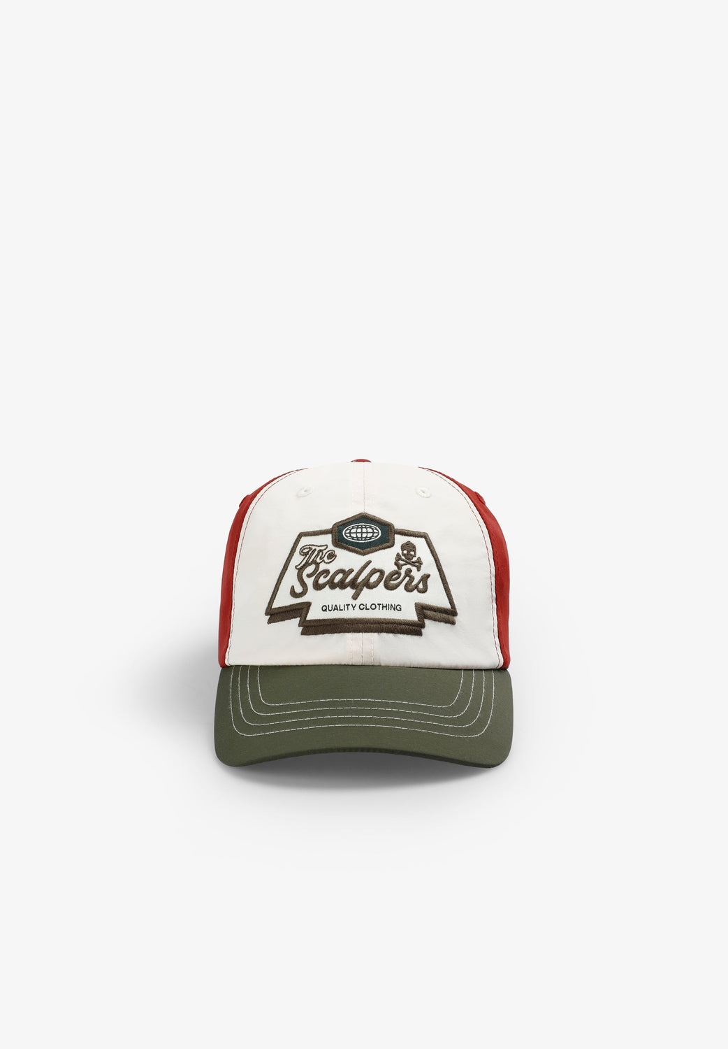Three-tone cap made of nylon. Adjustable back and front embroidery with contrast logo and skull. Logo label detail at the back.